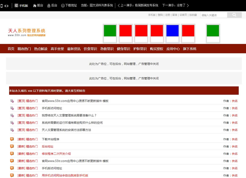 响应式图文资料列表系统后台应用中心可安装 模板、扫码打赏插件、手机版与电脑版智能管理插件、屏蔽复制与鼠标右键插件、老y文章系统数据迁移至天人工具、OK3W文章系统数据迁移至天人工具、用户注册后自动登录插件、悬浮贴边客服插件、会员前台全功能编辑器插件、广告可视化管理插件、前台底部自定义内容插件、畅言、友言、多说万能评论插件、电脑版整站背景图插件、万能伪静态规则生成插件、手机版广告插件、手机版内容阅读权限插件、QQ登录插件、新浪微博登录插件、微信登录插件、保存远程文章图片至服务器插件、图片水印及尺寸调整插件、3种模式弹窗插件、会员在线支付充值积分(付费阅读)插件、文章内容部分可见预览插、文章定时发布插件、响应式模板关闭手机版插件、PC及移动端视频音频播放插件、自动采集插件、前台鼠标经过标题提示框插件、文章底部单独下载地址带按钮插件、文章内容图片点击放大插件、文章内容插入html代码框插件、前台图片鼠标经过动感放大插件等等