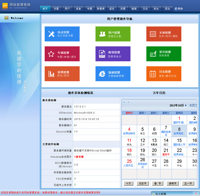宁志网站管理系统是国内知名建站软件,它由技术人员开发好了的一种现成建站软件,主要为全国各地方部队军区、自助建站提供方便。网站系统无复杂的安装设置要求,适合广大工作人员使用。特点:安全、稳定、美观、实用、易操作……可设管理员权限分配。