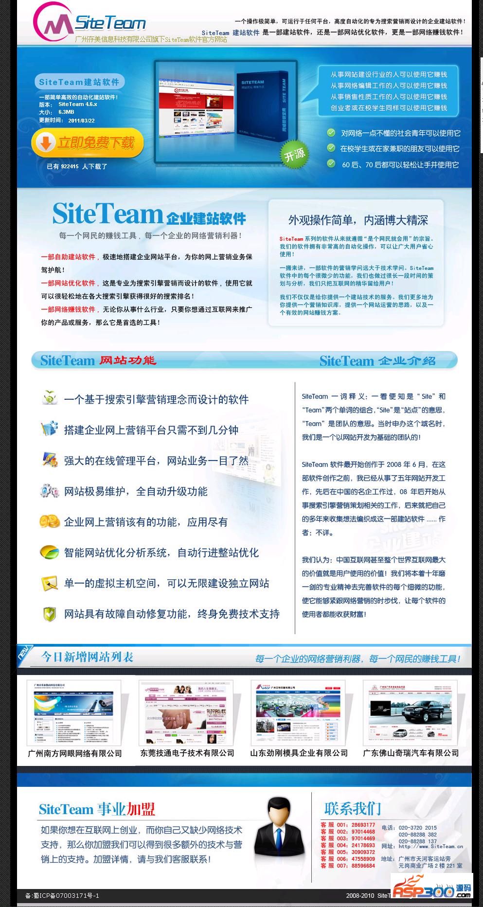 SiteTeam企业自助建站软件是一部专业为搜索引擎营销(网站优化/SEO)而设计,操作极简单,网站极稳定、故障自动修复、在线升级维护、建站速度极快、专为大众上网营销而设计的完全免费开源企业建站系统!