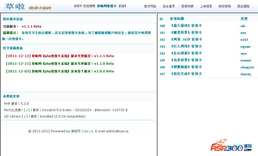 草啦网php密保卡系统有效的防止密保卡被木马截图。支持多种类型的密保卡原图直接上传。查询方便快捷 ,用自己的网站空间管理自己的密保卡。草啦网php密保卡系统1.有效的防止密保卡被木马截图。