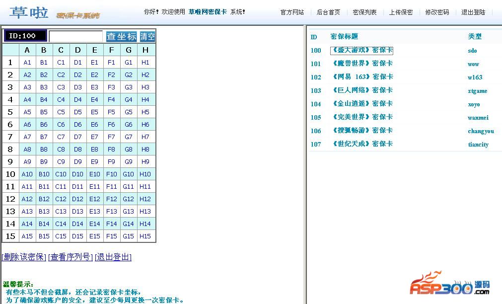 3.查询方便快捷 ,用自己的网站空间管理自己的密保卡。