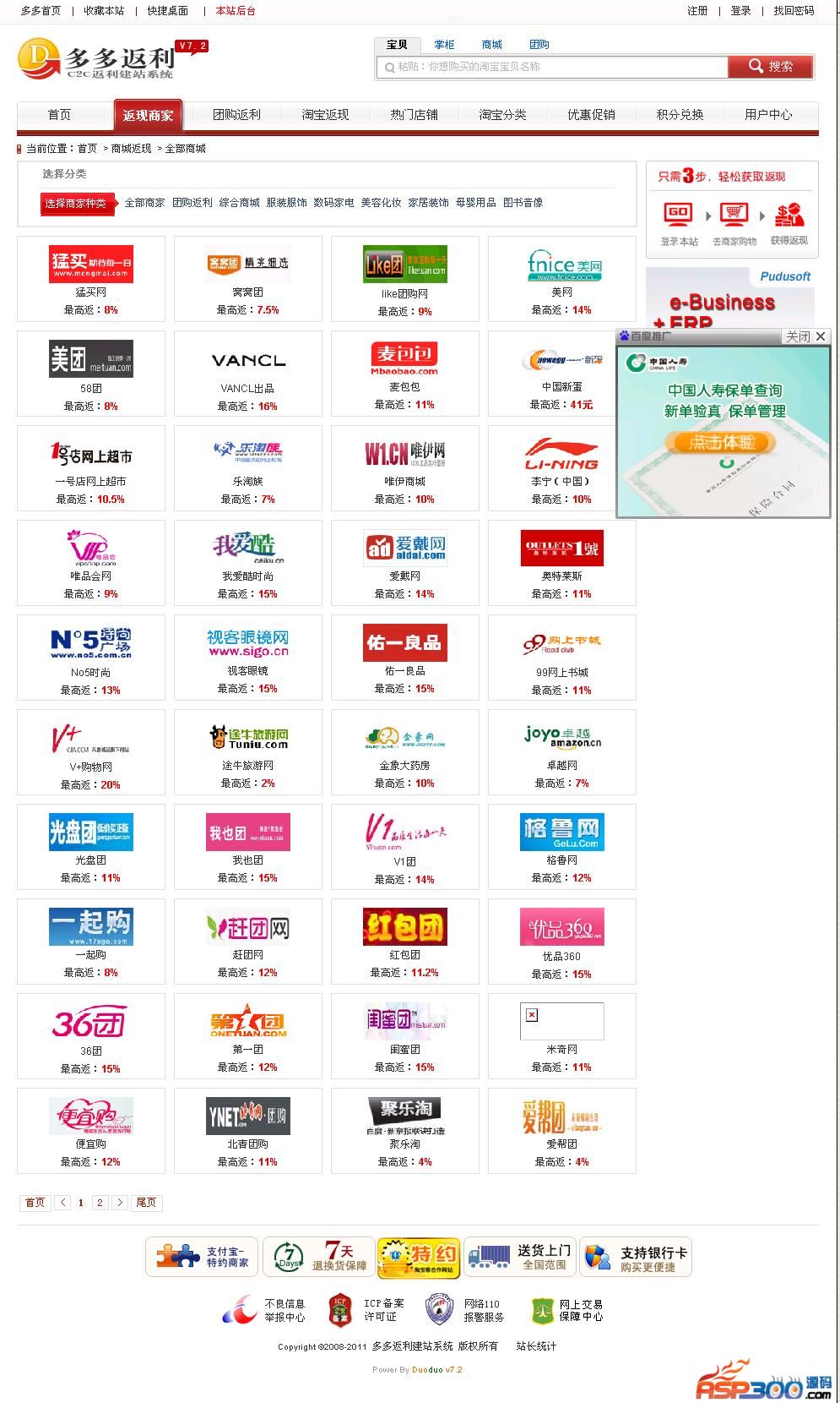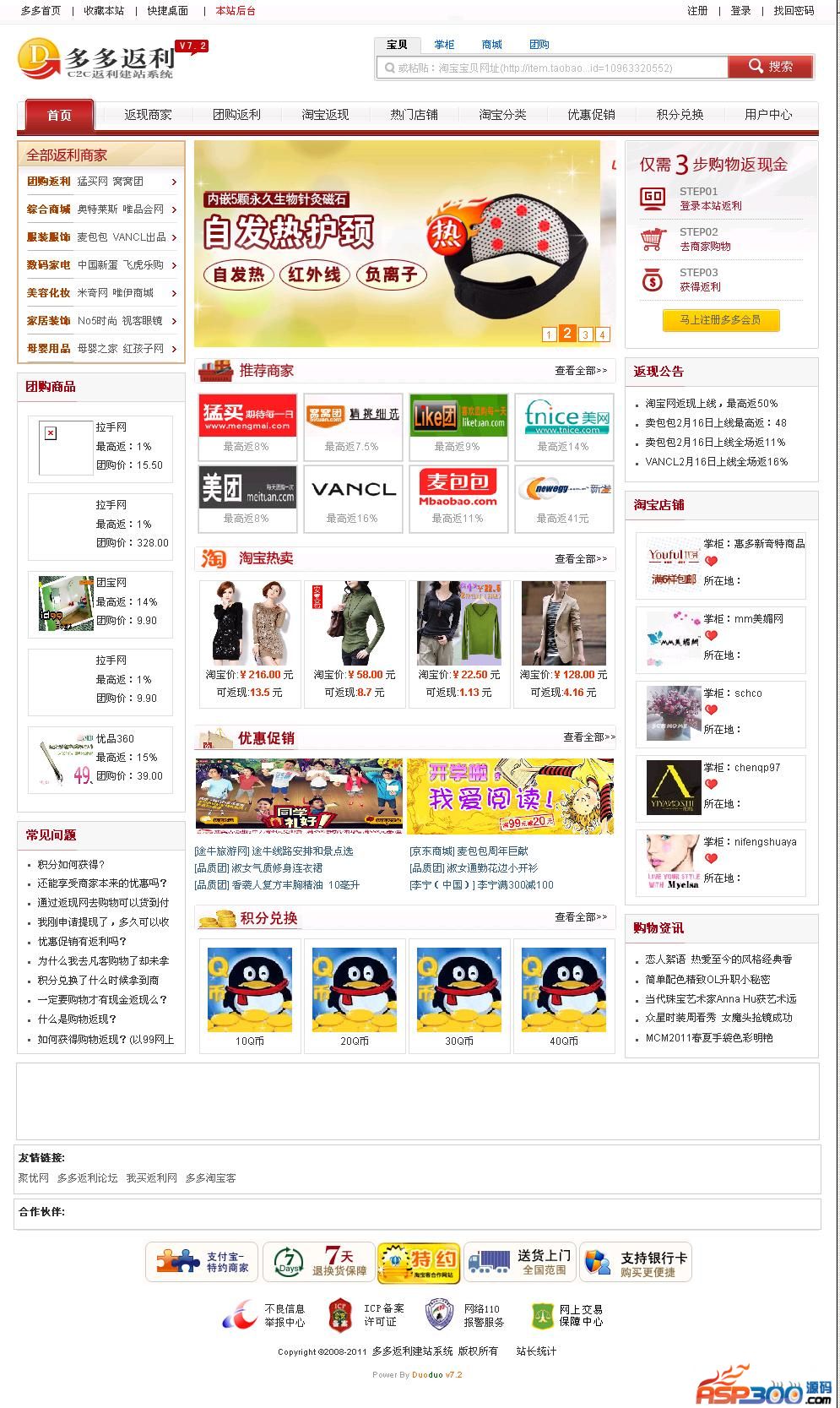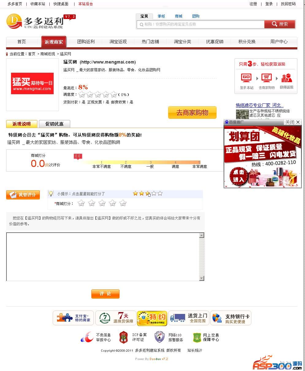 其他说明:多多返利(淘宝客)建站系统V8,采用了全新模版界面,集成全新淘宝、拍拍返利API接口,并带有商城返利、晒单分享、积分兑换、团购返利等功能,全新的功能体验