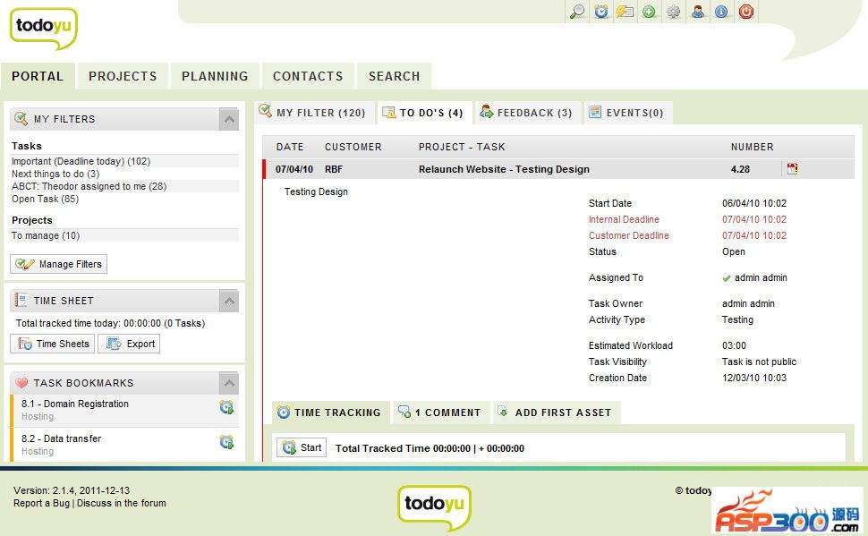 todoyu是一个PHP开源的任务/项目管理系统,时间跟踪和协作开发应用程序。它拥有一个流行的Ajax操作界面,在每个项目上都可以有用户和客户。在todoyu中,项目被分成带子任务的多个里程碑并分配给用户。每个任务发费的时间将被记录。
