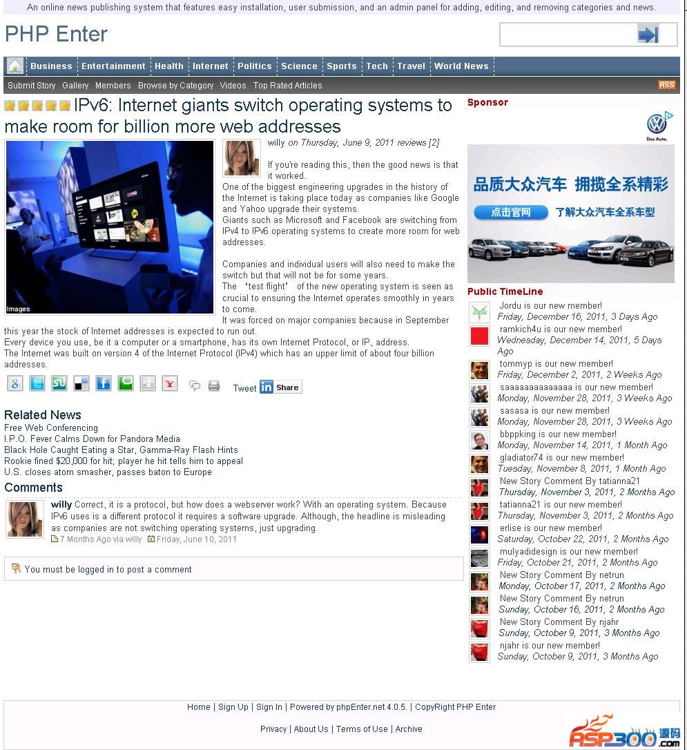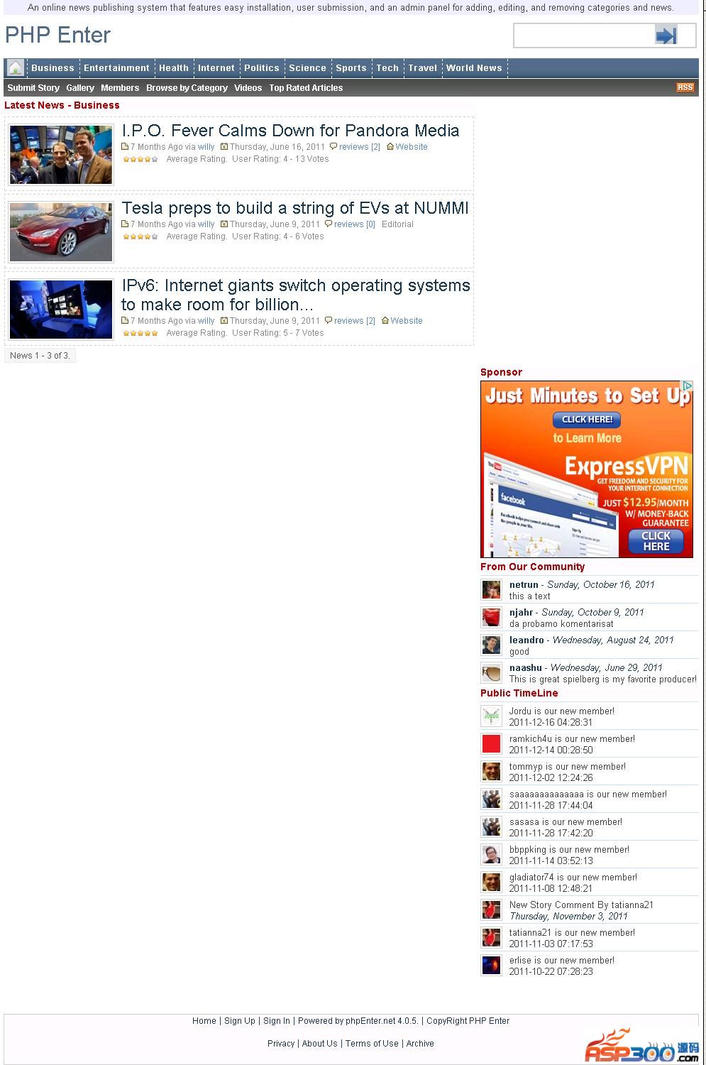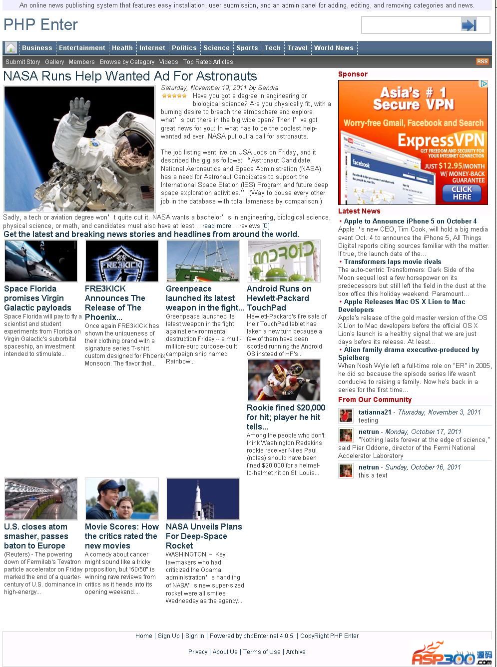 国外老牌新闻文章系统 PHP Enter一个在线新闻发布系统,具有安装方便,用户提交,以及添加,编辑和删除类别和新闻管理面板。