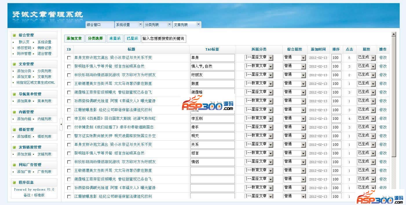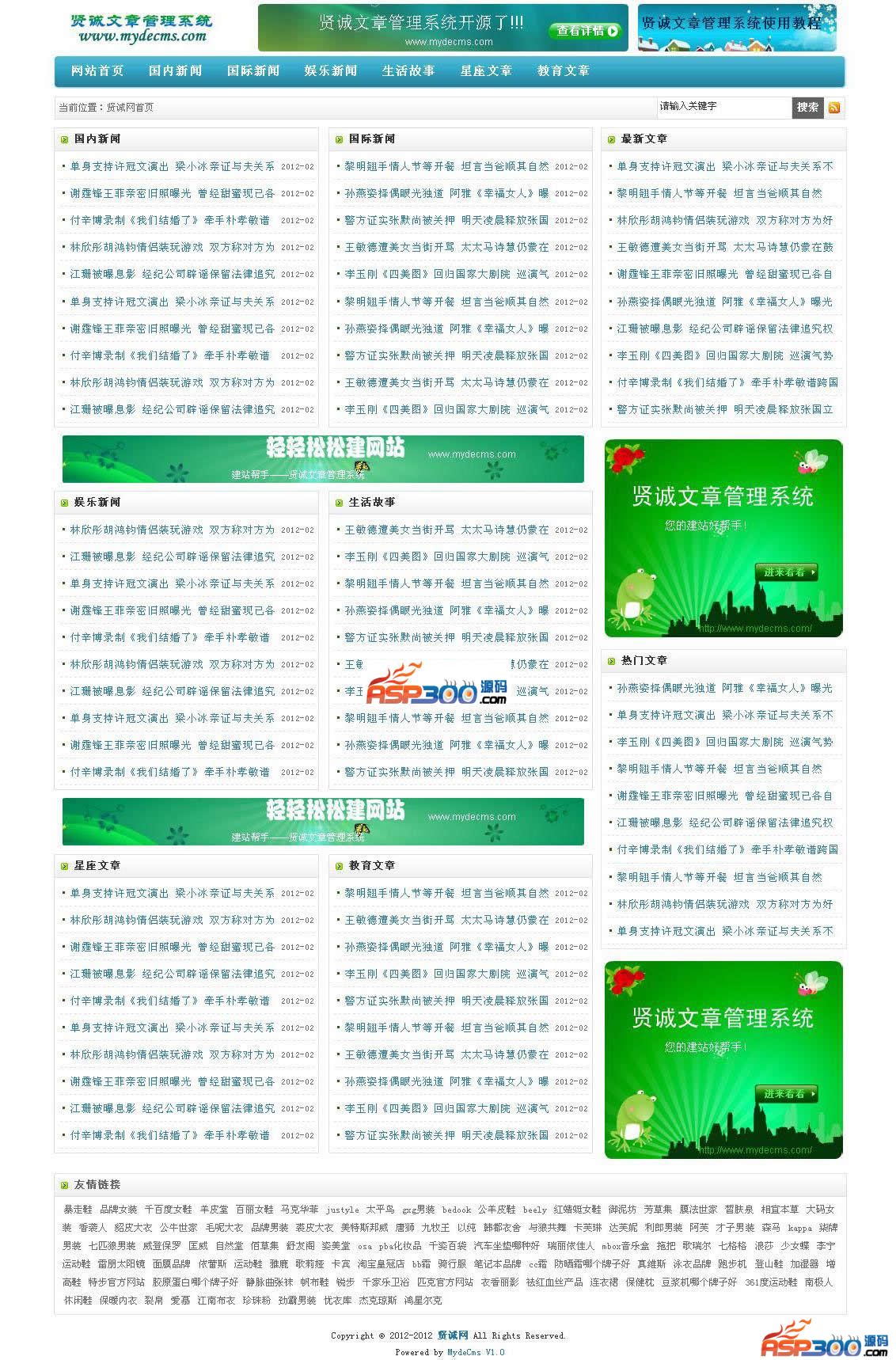 贤诚文章管理系统程序的安装文件是 setup.php ,程序安装及使用教程 http://www.mydecms.com/mydecms-jiaocheng/贤诚文章管理系统是一款采用PHP+Mysql开发的程序,前台采用DIV+CSS布局,PHP模板分离技术。主要功能有蜘蛛爬行统计器、无限分类、后台多框架小窗口操作。一、网站系统设置:1、自定义网站名称、网站首页标题、网站首页关键词及描述。2、自定义网站首页显示的分类ID及顺序。3、自定义文章生成HTML静态文件目录。4、蜘蛛爬行统计开关。5、可以添加ICP备案号及网站流量统计器。二、文章分类功能:1、文章无限分类功能;2、支持后台添加、修改、删除等操作;3、自定义分类的标题、描述及关键词;4、支持自定义分类模板文件;5、自定义分类静态目录。6、自定义分类排序。三、文章功能:1、支持后台添加文章、修改文章、删除文章等操作;2、自定义文章标题、文章关键词、文章描述;3、自定义添加TAG标签;4、自定义文章所属分类;5、文章可以设置总置顶、分类置顶及普通文章三种属性;6、HTML在线所见即所得编辑器;7、可以控制文章是否在前台显示;8、可以按分类显示文章;9、可以按未显示或者已显示两种方法显示文章;10、支持批量修改文章的TAG标签、所属分类、文章置顶属性、文章前台是否显示属性、批量删除文章;11、支持生成指定区域的文章,比如将ID从1到100的文章生成静态HTML页面;12、一键清空网站所有的文章,此功能操作后将无法恢复文章,谨慎使用;13、一键将前台属性为已生成的文章全部生成HTML静态页面;1、支持后台添加文章、修改文章、删除文章等操作;2、自定义文章标题、文章关键词、文章描述;3、自定义添加TAG标签;4、自定义文章所属分类;5、文章可以设置总置顶、分类置顶及普通文章三种属性;6、HTML在线所见即所得编辑器;7、可以控制文章是否在前台显示;8、可以按分类显示文章;9、可以按未显示或者已显示两种方法显示文章;10、支持批量修改文章的TAG标签、所属分类、文章置顶属性、文章前台是否显示属性、批量删除文章;11、支持生成指定区域的文章,比如将ID从1到100的文章生成静态HTML页面;12、一键清空网站所有的文章,此功能操作后将无法恢复文章,谨慎使用;13、一键将前台属性为已生成的文章全部生成HTML静态页面;四、模板功能:1、支持后台添加模板、修改模板、删除模板等操作;2、模板备注功能,可以很清楚的明白哪个模板的用途;3、批量删除多个模板文件;更多风格模板请访问 http://www.mydecms.com/mydecms-moban/五、内链功能:1、支持后台添加内链、修改内链、删除内链等操作;2、可以自定义内链关键词、内链地址、target属性及内链排序;3、批量修改内链记录的target属性及排序;六、友情链接功能:1、支持后台添加友情链接、修改友情链接、删除友情链接等操作;2、可以自定义加友情链接关键词、地址、target属性、排序及前台显示属性;3、批量修改友情链接记录的target属性、排序及前台显示属性;4、友情链接前台显示属性分只在首页显示、只在内页显示、首页和内页都显示及首页和内页都不显示四个选项。七、附件功能:1、支持后台上传文件功能;支持jpg、gif、bmp、jpeg、png、rar、zip、swf、mp3、wmv、doc、xls、wav、rmvb、rm格式;2、支持移动附件位置、删除附件;八、蜘蛛爬行记录管理功能;支持只显示指定名称、全部的蜘蛛爬行记录、一键清空所有蜘蛛爬行记录;九、广告管理:可以在后台添加、修改、删除广告。十、后台支持多个小窗口框架操作:点击后台左边的菜单时,后台的上方会新增加一个小窗口框架,这样就不用刷新之前操作的页面了;