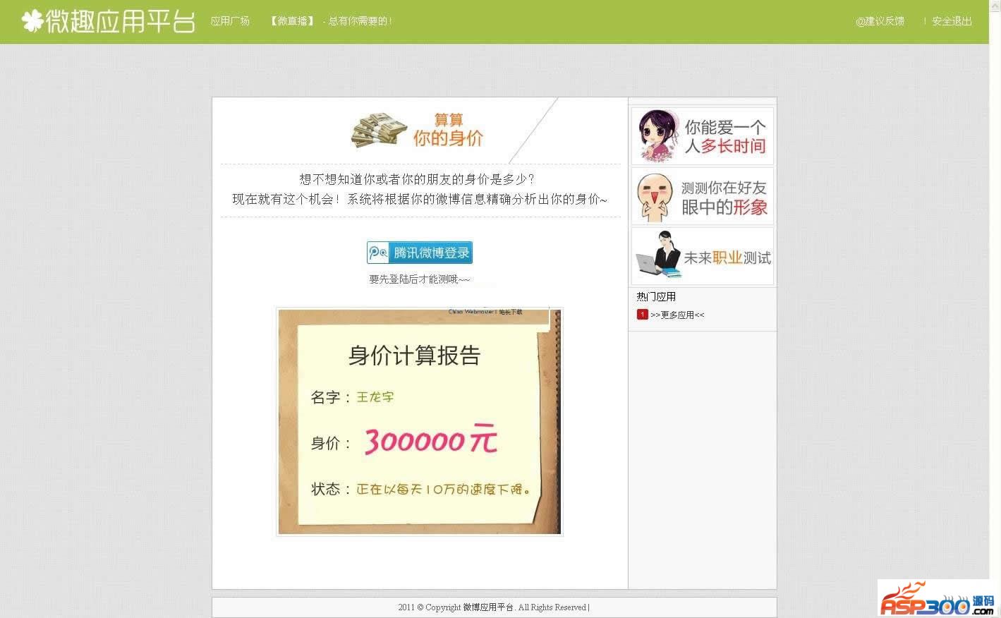 想不想知道你或者你的朋友的身价是多少?现在就有这个机会!系统将根据你的微博信息精确分析出你的身价~ 下载地址 下载地址已转移到新版网站,请点击左上角-首页,在新版网站搜索此套源码的标题进行下载。
