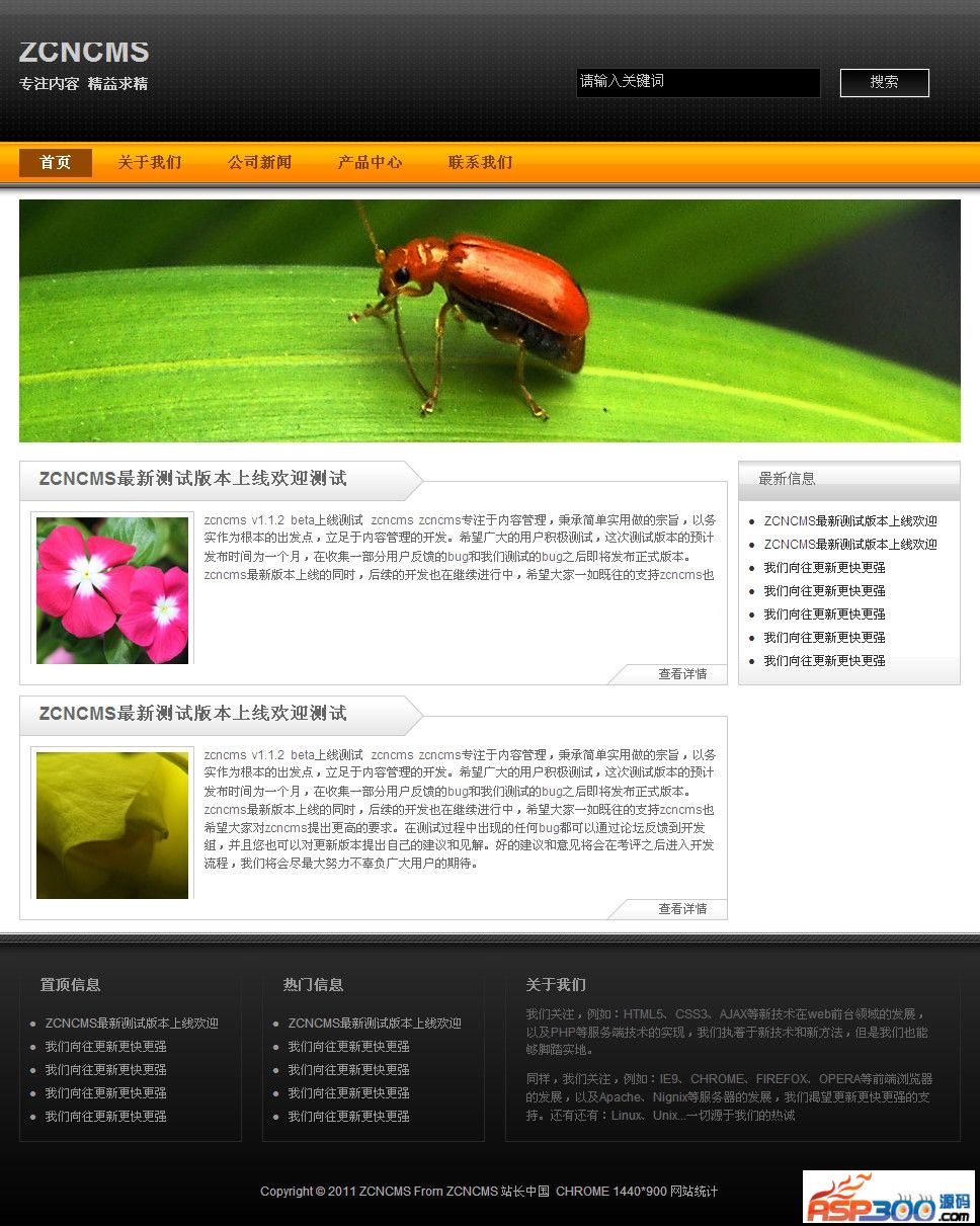 ZCNCMS专注于内容管理,秉承简单实用做的宗旨,以务实作为根本的出发点,立足于内容管理的开发。ZCNCMS使用简单模板美观大方,十分适合企业建站小门户网站,程序部分不需要二次开发即可实现产品展示案例展示等功能。