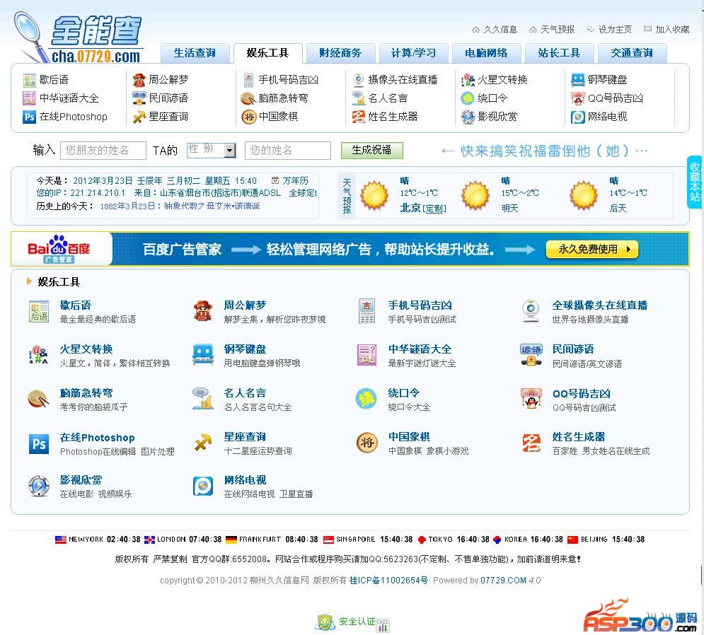 7、关于版权和头部、统计等相关信息,请到后台修改对应的JS文件 点击 广告管理-所有广告列表 如:底部:footer 头部 header 统计:tongji 点击编辑 修改即可。(注意,修改好的内容一定要点击开始播放)8、关于今后程序升级:进入后台/07729 查看 常规管理-程序升级管理 (程序有升级官方会有提示)