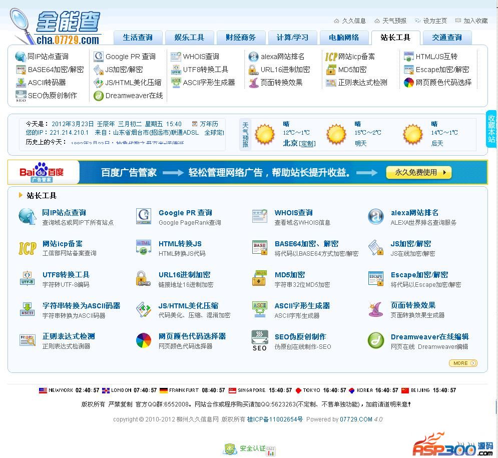 后台地址/07729 账号:07729 密码:07729使用说明:1、本程序采用PHP+ASP架构。需要支持PHP+ASP的空间才能正常运行,本地测试需要PHP+ASP环境,如果单独使用PHP环境测试,天气预报程序会弹文件下载提示,部分asp程序不能正常运行。如果单独使用ASP环境测试,PHP程序则无法运行。空间大小需1G-2G左右,为以后方便升级。2、使用本程序需注意:要生成自己的天气预报首页必须先进入后台填入正确的域名信息。填写好相关信息后要重新生成静态页才能访问。后台地址/07729账号:07729 密码:077293、由于城市天气页比较多,建议在本地生成好了再上传。生成城市天气页的过程中比较耗费CPU资源,所以在不是非常好的空间上运行可能会有中断现象。建议在本地生成。生成ID段最好分为0-100 100-200 200-300...以此类推。生成城市详细天气页的文件夹为weatherhtml,城市介绍文件夹为cityintrohtml。生成天气页面后,程序每天自动采集中国天气网最新天气信息。采集不再占用空间,和原来的空间大小相等,无需管理维护。天气视频以当天新闻联播播出过后为准。4、全站广告位。进入后台广告管理修改,/07729 点击 广告管理-所有广告列表 点击编辑 修改添加即可。其它模板文件也可进入后台修改。广告修改添加完毕记得点击-开始播放!5、SEO伪原创工具可以自定义添加关键字替换,后台路径为/seo/admin账号:admin 密码:admin此工具需要先安装,安装路径为:/seo/install/index.php 然后,输入空间商给你的数据库用户名和密码按照提示安装即可。(数据库必须为MYSQL)