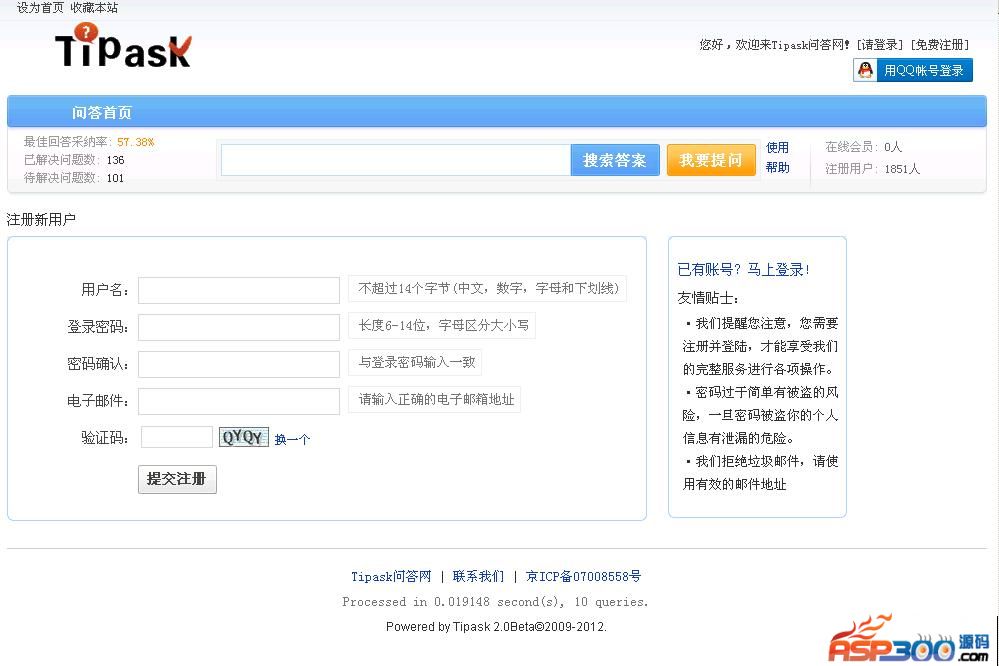 Tipask是一款开源、SEO友好、扩展性强、性能卓越的问答系统!Tipask 独特的MVC构架,使得二次开发非常容易,多种接口方便和已有系统整合。我们的使命:努力打造最适合国人使用的问答系统!