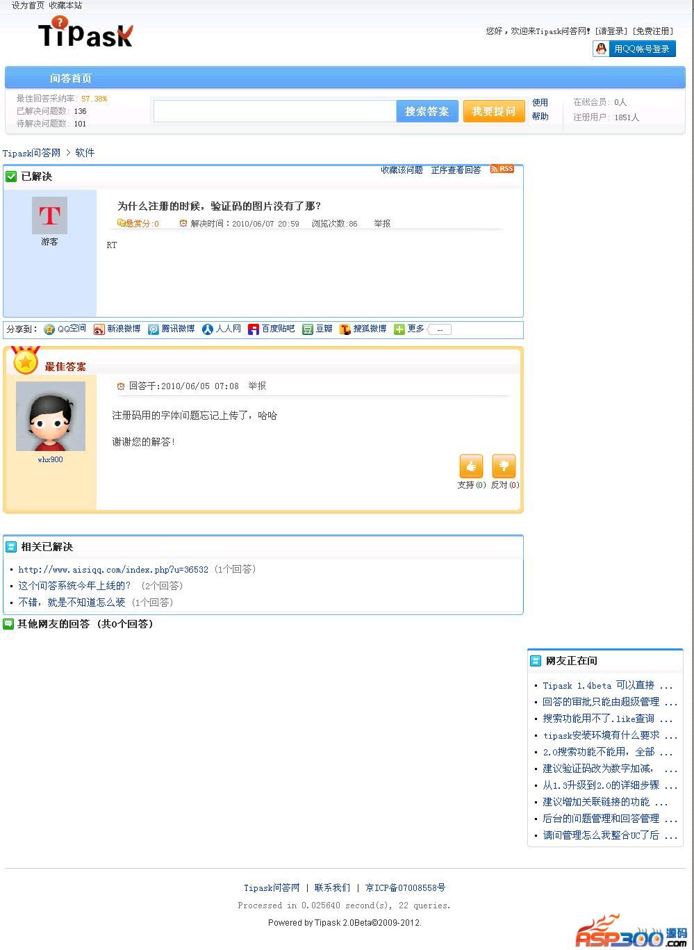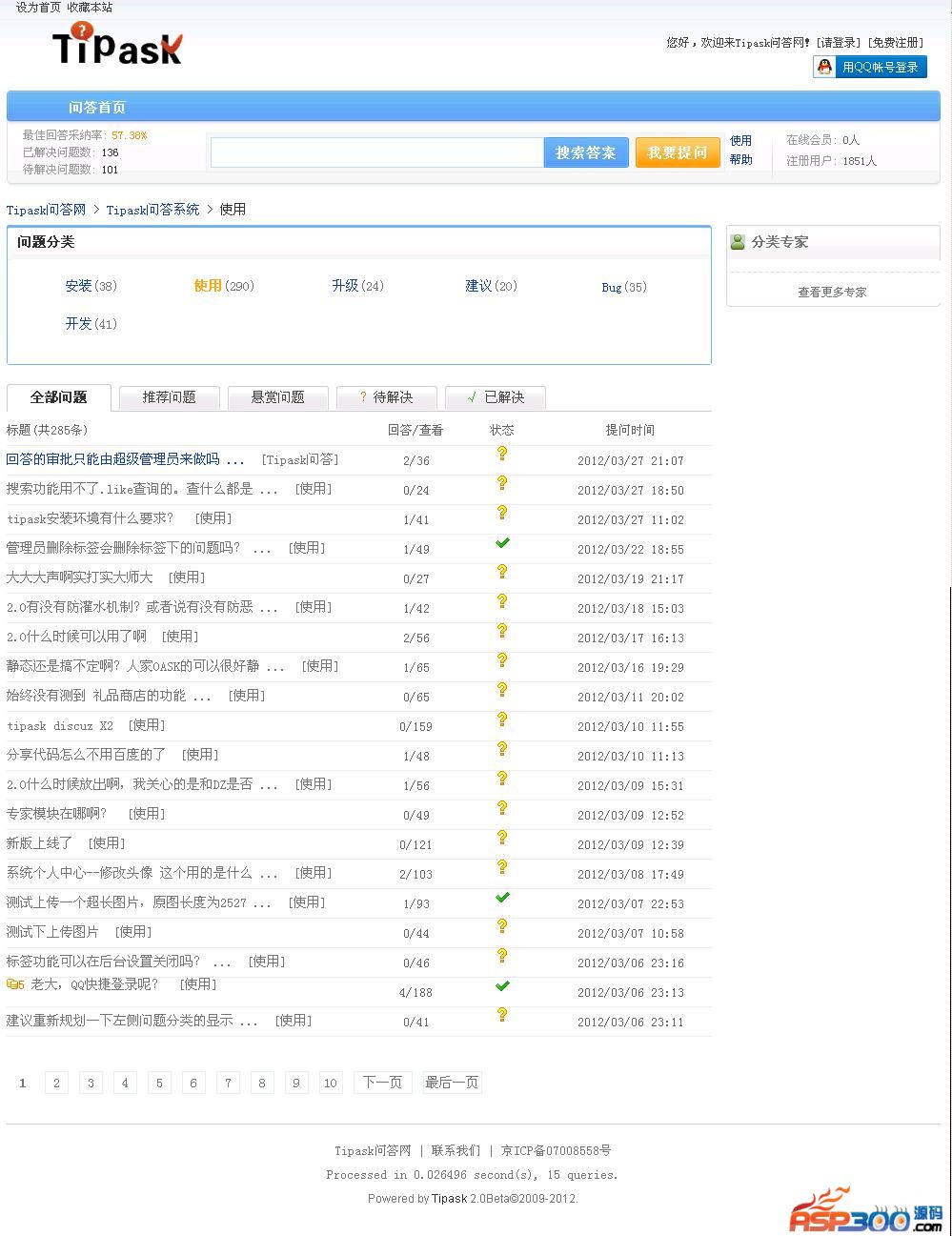 Tipask是一款开源、SEO友好、扩展性强、性能卓越的问答系统!Tipask 独特的MVC构架,使得二次开发非常容易,多种接口方便和已有系统整合。我们的使命:努力打造最适合国人使用的问答系统!Tipask系统特性