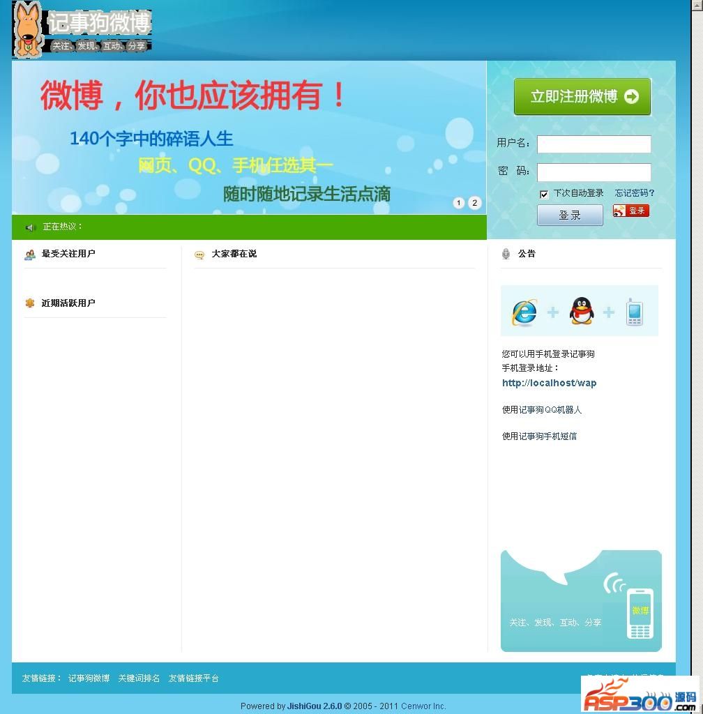 记事狗微博系统是一套业界领先的开源PHP微博程序,其支持Web、手机、短信、QQ机器人等多种方式发布内容,并可通过QQ即时通知、站外调用、同步到新浪微博、腾讯微博(可使用微博账户登录、注册绑定)等传播内容,是现在最热门、最火爆的互动系统。