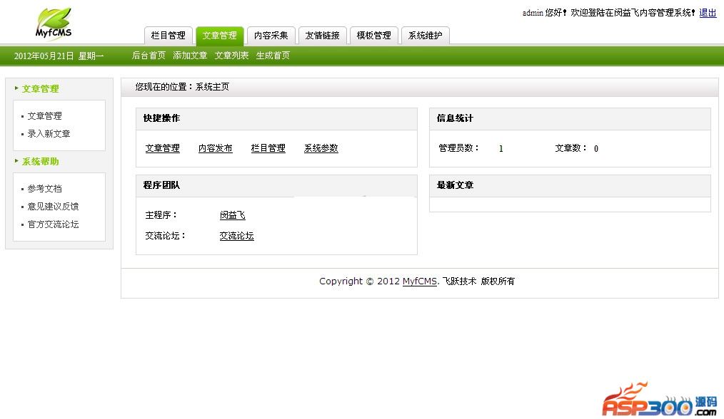 闵益飞内容管理系统英文缩写MyfCMS,采用PHP5+MySQL作为技术基础进行开发。MyfCMS的模板引擎使用了当前最流行的smarty模板引擎,MVC框架采用了自己研发的MyfMVC框架(特轻量级的PHPMVC框架,以速度快为优势)。MyfCMS的开发者有5年多的开发经验,一直从事互联网信息系统建设,结合这几年的开发经验,创作了MyfCMS系统。作者为什么要开发MyfCMS呢?在作者仅几年互联网的打拼过程中,给企业公司做站,大部分都用织梦CMS系统,但是长期困扰作者的是版权问题,织梦的系统虽然完全开源,但是商业盈利或企业政府站均需要支付版权费用,而很多企业的网站都比较简单,织梦CMS系统的功能仅能用到20不到,却要支付全部的功能费用,而且本来很多小企业做网站的预算费用就很低,无法支付那么昂贵的版权费用。作者知道的其他CMS系统如:phpcms、帝国、动易等等虽然都开源,但是都不能用于商业用途。MyfCMS是中国首款完全开源免费的PHPCMS系统,任何个人或组织,不论盈利与否均可免费使用!MyfCMS1.0系列是建立在ThinkPHP的基础上开发的CMS系统,之前作者选用它(ThinkPHP)是因为它的开发效率特别高,而且也是PHP生态圈中非常优秀的MVC框架,但CMS上线一段时间后作者发现ThinkPHP特别臃肿,不适合做CMS系统底层架构(但是ThinkPHP作为企业的内部信息系统建设还是挺有优势的),于是作者整理了这几年的PHP开发作品,吸取ThinkPHP的操作优点,开发了MyfMVC框架。MyfCMS2.0系列是建立在MyfMVC和Smarty模板引擎之上的全新的PHPCMS系统,它最大的优势就是速度快,模块经典,能够满足大部分企业的建站需求。