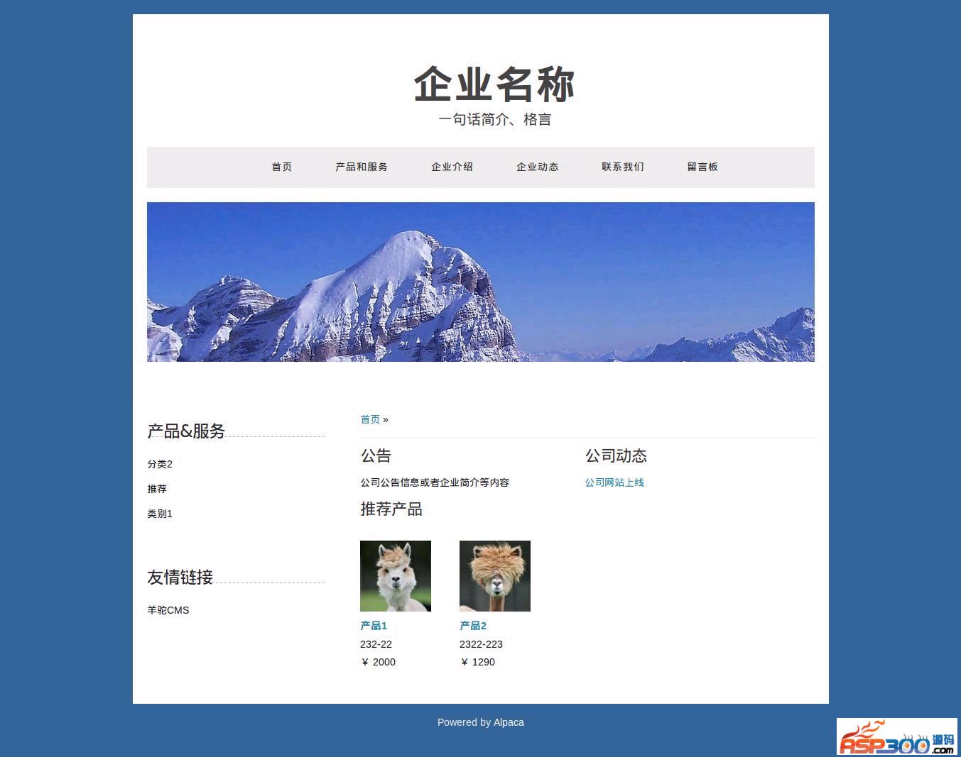 羊驼 v3.8 企业版(仿阿里巴巴单企业界面)方便中小企业建站使用,包含产品、新闻、网上询价等模块。羊驼! 是一个开源的轻量级树状 CMS 系统。 它基于 php + mysql 并以 b2core MVC 为底层架构。 可以方便快速的配置出个人、企业网站。在B2Core 优雅的MVC架构之上你可以轻松定制任意应用型网站。羊驼 v3.8 企业版更新:修复了后台错误,和前台图片地址问题。企业版主要是针对中小企业建站的需求做了进一步的定制,主要有1. 参照阿里巴巴单企业的界面设定栏目。2. 通过模板和模块功能配置了产品、新闻栏目3. 通过插件 freeform 配置了在线订单功能。