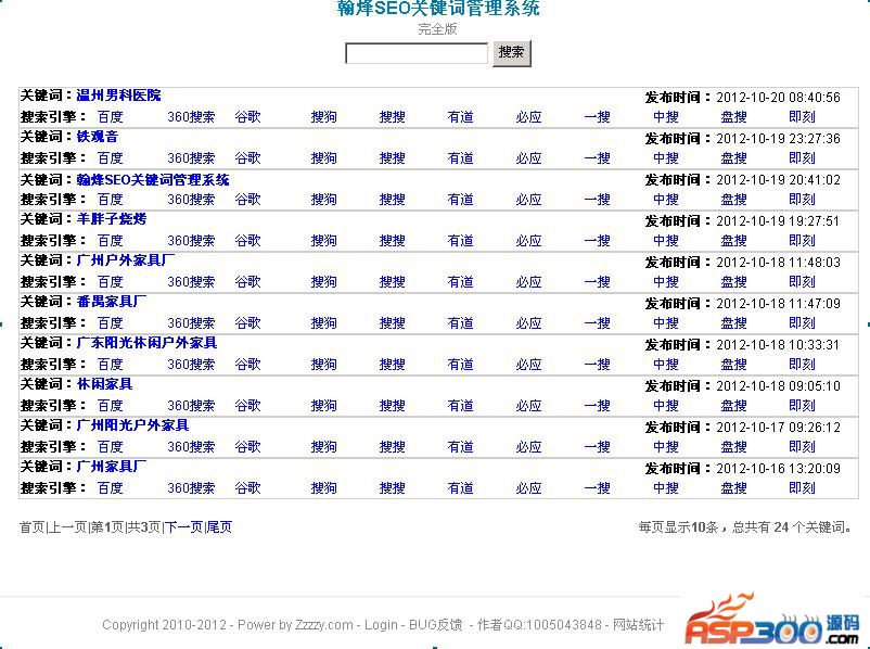 1、添加关键词,并且自助加入每个关键词在国内各搜索引擎排名情况。2、添加网址,自助加入每天收录和反链在各大搜索引擎的情况。3、集全国内各大搜索引擎: 百度、360搜索、谷歌、搜狗、搜搜、有道、必应、一搜、中搜、盘古搜索、即刻等国内搜索引擎。4、可自助加入每天的工作日志。5、后台可更改和删除关键词网页和数据。6、可查询关键词并高亮显示。