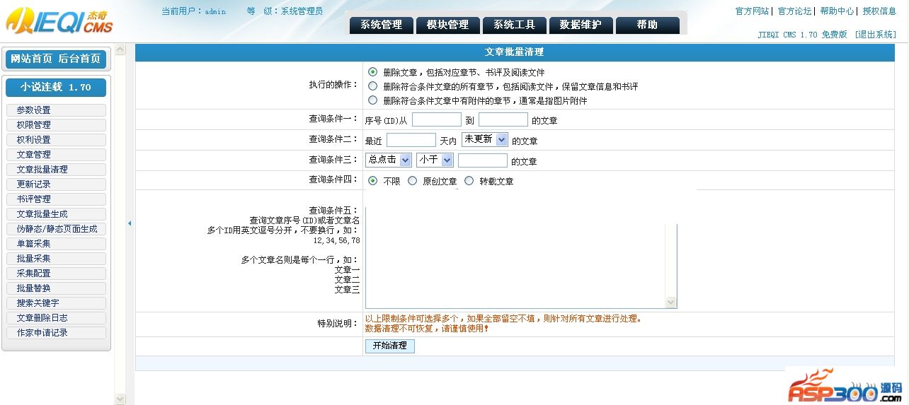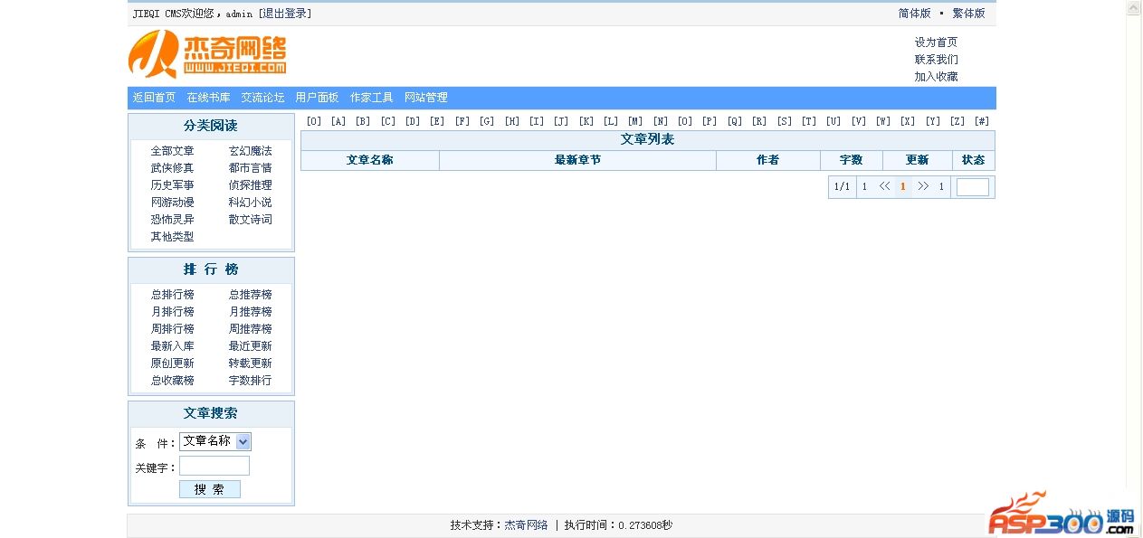同步作品:后台小说连载模块->同步杰奇书盟。本程序默认同步书盟所有作品,如果一次没有全部同步完成关闭了浏览器,下一次执行本程序会继续同步。但是不要开多个窗口同时执行本程序,否则可能内容错乱。