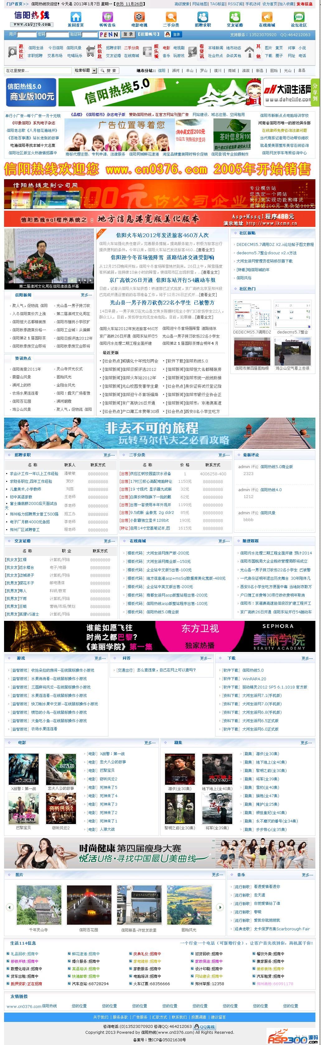 信阳热线5.0是基于最新版dede5.7sp1内核开发构建的,网站带全部数据。并整合了discuz论坛,实现一站注册登陆。 网站包括文章、图片、下载、商城、二手、人才、交友、游戏、电影、音乐、留言、黄页、圈子、问答、论坛等频道。 适合做地方热线信息港和行业站。