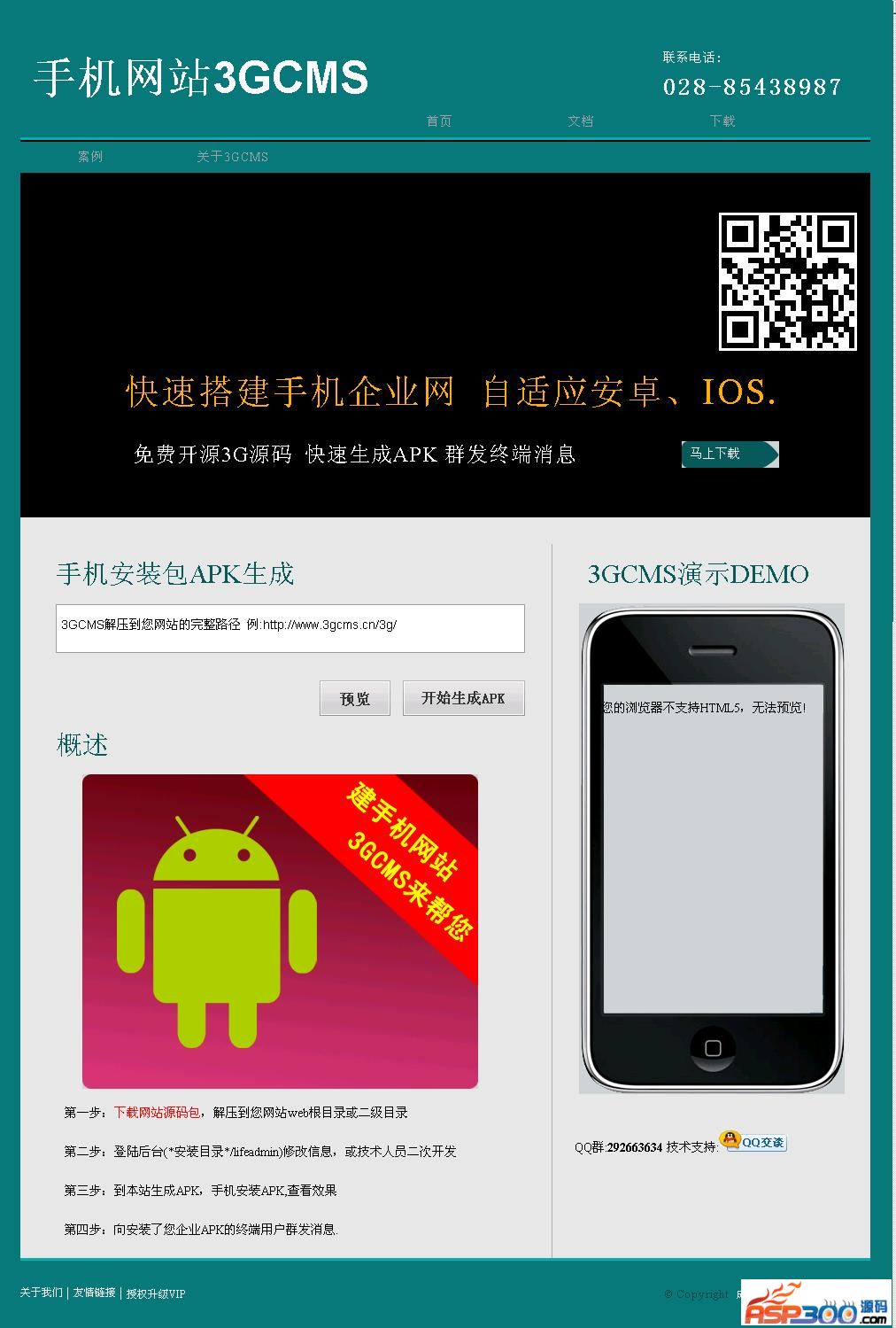 3gcms是一个免费开源的,快速、简单的面向智能手机等移动终端的网站CMS系统,自动生成手机安装包APK.并提供终端消息推送,手机版后台管理等功能。