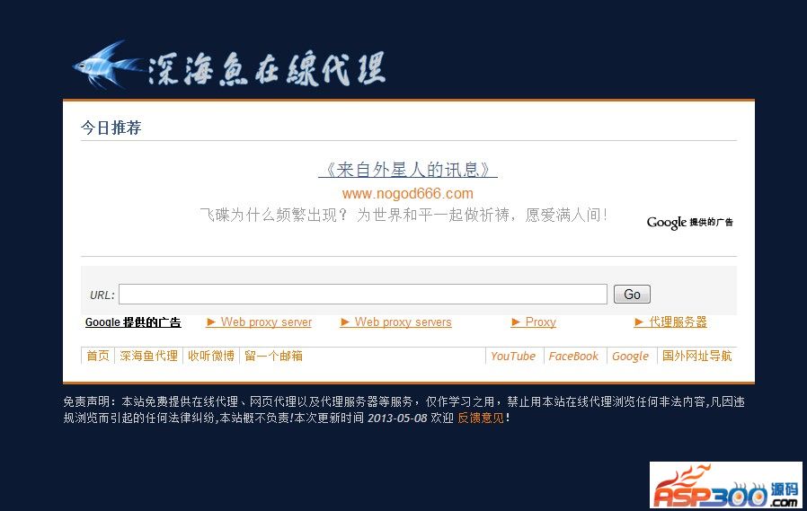 首页,只要保证form的action值为proxy.php页,其他地方均可修改,包括固有的广告,但希望您保留深海鱼在线代理的友情链接,也方便您获取本源码的最新版本。