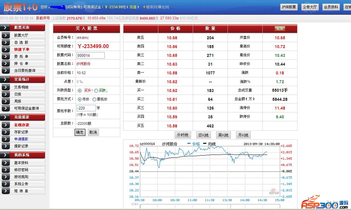 在线炒股网站。环境:PHP+SQL, 打开网站注册会员,可以注册模拟账号和真实账号!就可以直接炒,杠杆比例后台调节,在线入金,在线出金!可开设模拟账号和真实账号!代理功能等。。。 演示 http://gp.086178.com 该演示平台是一模一样的,由于是演示,请不要入金!网站安装了两套在线支付接口!,新闻,短信,走势图,在线支付,在线提现,各种功能齐全! 图就不截了,请自己看演示