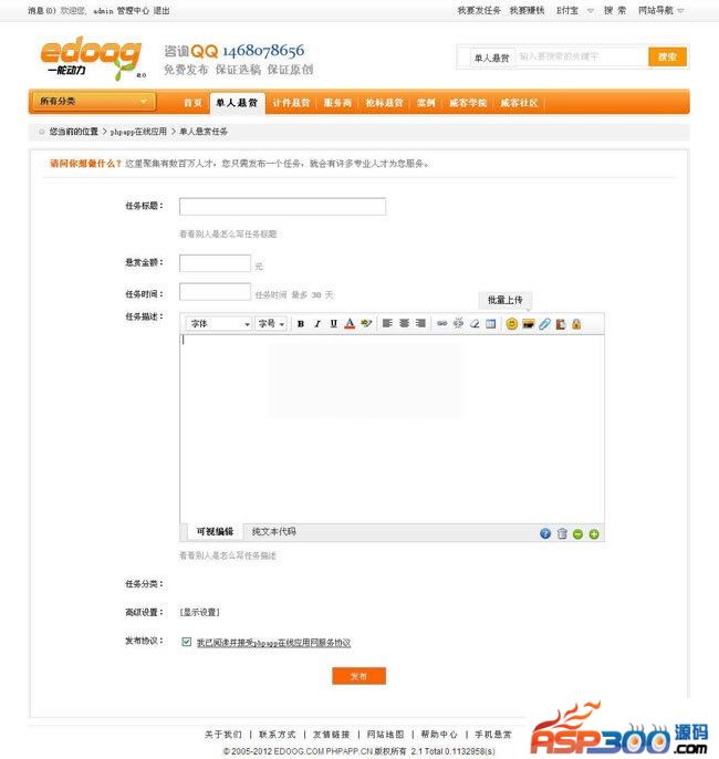 APP 是EDOOG 旗下新产品,全球领先的网站应用系统。PHPAPP 全球网站应用的开创者,独创系统核心长期提供丰富网站应用程序,专为站长企业打造盈利应用。威客交易程序 站长赚钱首选程序!!!安全: 独创全ID URL直接屏蔽SQL注入问题,提供过虑系统对提交的数据进行过虑。高效: 独创 AVC ( 应用Application 视图 View 和控制Controller ) 面向过程垂直设计,程序逻辑清晰运行速度快。双核心: 独创 www 网站系统 支持 wap 手机系统 双核心,一程序多显示多用途多语言: 独创独立语言包,多语言显示扩展: 独创无限应用安装扩展应用与windows软件一样安装,卸载简单,应用独立系统其它升级安装不影响应用运行,二次开发学习简单。1.完美的 应用扩展二次开发应用直接后台创建,安装应用支持批量安装 zip 压缩包或安装解压包,无限的扩展体系。应用拥有独立的 权限;配置;管理等只要您想得到的应用,都能开发实现。2.完美的 优化SEOPHPAPP 支持 自定义 伪静态URL和生成HTML静态部属,与应用的SEO设定完善解决 SEO优化问题。可以对URL进行改名,URL地址想怎么变就怎么变。3.完美的 帐务管理当时用户交易情况如 交易金额;交易对象;资金流向等详细记录,并与订单关联,可以追踪到某个任务上。交易金额的来龙去脉一目了然。4.完美的 编辑器edoog 自主开发的 edoog 2.0 编辑器与系统完美结合,支持 隐藏;批量上传图片;上传文件等并显示进度。并提高用户上传图片附件的操作体验5.完美的 任务流程任务模拟商品交易流程,交易时生产订单,可对订单批量管理,发货,支付,退款等流程。6.完美的 任务操作任务前台 支持 批量 中标;不合格;点评等会员中心支持 批量 发货,支付订单管理7.完美的 后台管理员配置通过配置应用权限,生成出应用的动作权限,高达上 1000 个权限控制.把后台管理权限分配到应用动作每个页面上。8.完美的 接口配置消息接口;邮箱接口;动态接口;短信接口;积分接口; 等,可以把应用配置并设置用户组使用权限使用这些接口。使应用能发送消息,动态,短信等。9.全新的 开发人员工具功能可以调用数据与设置模块,生成的标签写在模板,前台的每一点一滴都在后台控制。10.全新的 后台风格使用全新的传统风格让更多站长操作更方便。11.全新的 语言管理功能前台后台支持多语言切换。12.全新的 道具商店功能目前现在 7~8 种道具,用户购买道具网站直接营利,道具将持续开发让站长赚钱更简单更轻松。13.全新的 单人悬赏功能全新开发的单人悬赏支持批量操作;诚信设置;使用道具;流程完善批量操作: 采纳;不合格;点评;发货;支付等诚信设置: 防止用户恶意不选稿退款等操作,当用户设置诚信后按诚信进行操作,提高任务的交易。使用道具: 可以将任务置顶在列表,显示地图方位,设置隐藏等操作,用户购买后网站获得营利。流程完善: 任务的每一步流程都与订单关联,支付,退款等实现交易体系的完善。14.全新的 计件悬赏功能全新开发的计件悬赏支持批量操作;诚信设置;使用道具;流程完善功能同单人悬赏外,计件采用新的倒计中标算法。什么是倒计中标?就是按多少量进行中标并排除中标的稿件,只做剩下的名额并稿件只能投剩下名额。到期后如有剩名额,系统直接退款剩下的名额赏金。保证了雇主的权利,同时又保证了投稿不浪费的合理性。15.全新的 抢标悬赏功能全新开发的抢标悬赏支持批量操作;诚信设置;使用道具;流程完善功能同单人悬赏外,抢标悬赏与服务商资源进行整合。当用户投标时,系统读取用户所卖的服务 报价,时间,信用等,先投标排名在前有抢标的优势。雇主选出满意的服务商后即中标,双方进行交易。保证了雇主的权利,同时又保证了投标不浪费的合理性。16.全新的 微博悬赏功能1.0(全自动版)全自动版微博支持 关注;转发;点评;操作当用户操作后按用户的 粉丝 立即获取赏金。目前该版本接口为 1.0程序企业适用17.独创的 链接悬赏功能(全自动版)EDOOG全球首创链接悬赏 站长10秒钟 100中标赚钱EDOOG完美的实力全力开发站长企业赚钱应用什么是链接悬赏?链接悬赏就是友情链接悬赏交换新站长做友情链接很难,所以只能用钱购买大站的链接交换.但找不到做链接交换站长。所以EDOOG针对这问题推出链接悬赏链接交换作用?链接交换来使新站获得访问量、增加用户浏览、在搜索引擎排名中增加重权收录、通过合作网站增加访问者的可信度等等链接悬赏功能使用方法?发布悬赏 -> 站长做好链接提交 -> 系统检测是否合格-> 站长中标得到赏金站长整个过程10秒就可以拿到赏金,史上中标最快最安全的应用悬赏。18.独创的 Wap手机功能当您开发完成PHP应用后,wap手机功能也自然的开发完成,只需修改手机风格页面。双核心,一程序多显示多用途,让程序赶上时代步伐。