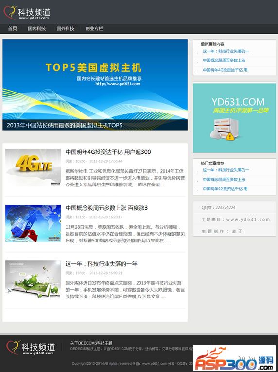 该模板来自www.yd631.com,适合用于博客、科技频道等需要图文并茂的展示内容及列表的,比较符合当下各种们门户网站的科技频道。比如腾讯科技和网易科技也都把网站界面改成这样的扁平化界面。