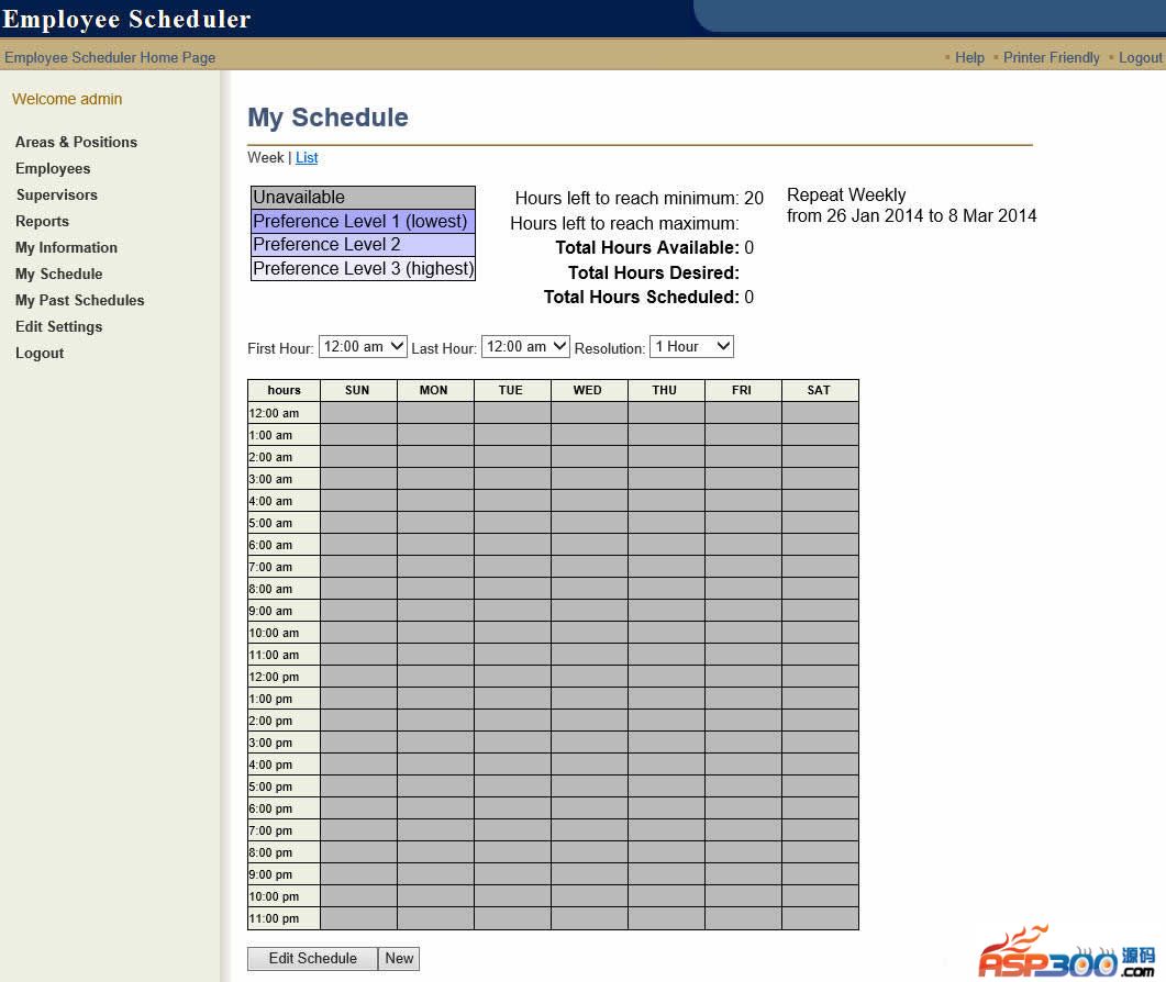 Employee Scheduler可以让您的员工登录并输入他们的首选工作日程。然后让上司能够登录,并在其雇员职位的基础上安排工作。它需要PHP和MySQL数据库。 下载地址 下载地址已转移到新版网站,请点击左上角-首页,在新版网站搜索此套源码的标题进行下载。