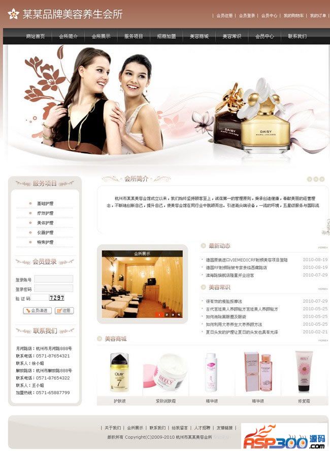 前台包括会所简介,会所展示,服务项目,美容商城,会员常识,招商加盟,会员登录等。