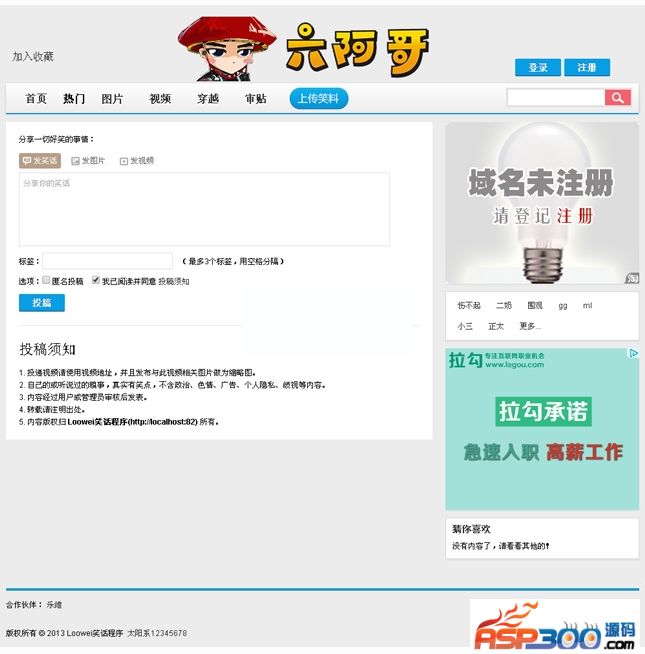 仿嘻嘻哈哈笑话网是基于ThinkPHP框架开发的开源程序Loowei笑话程序的笑话分享类网站模板,借鉴嘻嘻哈哈并结合自己的个人用户体验经验开发,本次分享只包括模板文件,原程序版权归Loowei作者所有。由于是开源程序,所以没有经过作者同意,打包原主程序和模板分享给需要的站长朋友们。