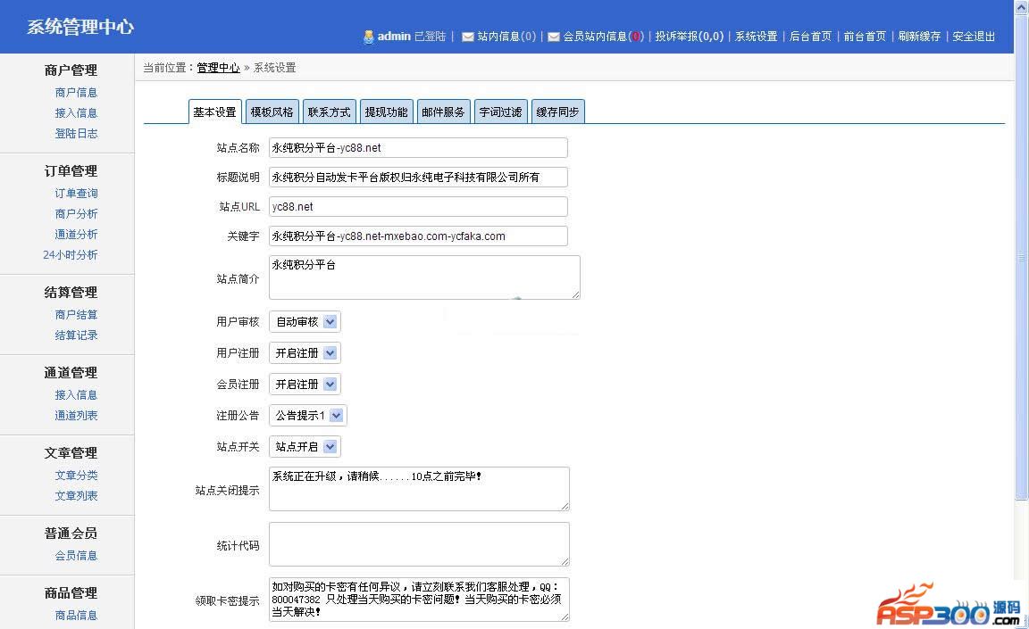 通道管理:接入信息里,添加新的接入商接入商编号:支付宝双接口编号:shuang支付宝免签约编号:alipay财付通转接编号为:ycfaka网银转接编号为:yc卡密转接编号为:yc