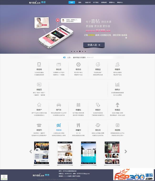 还包括微相册、智能客服、微服务、自定义菜单、微信会员卡、微留言、微酒店、微喜贴、微话题、微预约、微投票、微门店功能。