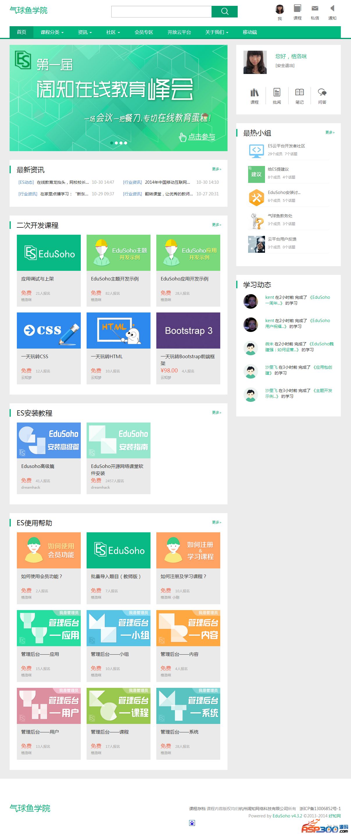 EduSoho 是协助机构和个人建立在线教育网站的开源建站系统,提供在线教学、网校管理、云视频点播等功能。EduSoho由杭州阔知网络科技有限公司开发,于2013年10月8日开放RC版本下载。