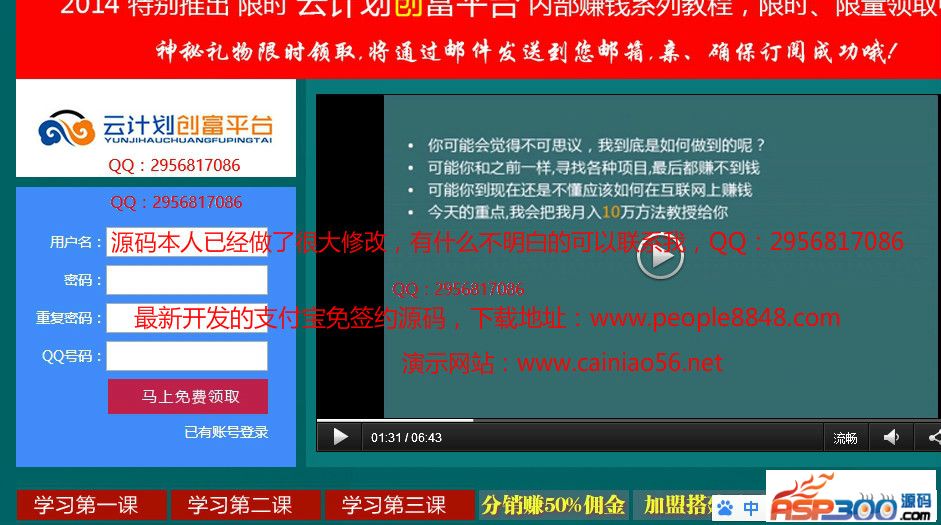 2014云计划官方原版源码大小16.82MB,小巧灵活,是网络赚钱首选,我相信下载的人都知道哦,这个是您想要的,带完整的数据库 带课程 和使用视频,绝对原版,拒绝高仿。