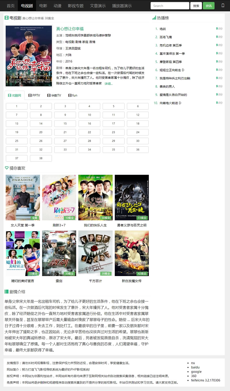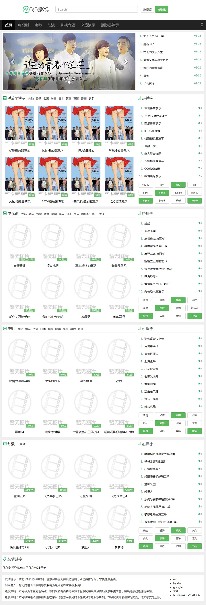 本着免费开源的宗旨、将飞飞影视导航系统(FeiFeiCms) 努力打造成为您身边最贴近的PHP电影建站程序!不需要庞大的空间与高带宽;一个普通的虚拟空间就可以迅速搭建起一个内容丰富的视频、资讯网站,使你的建站成本低至极点!