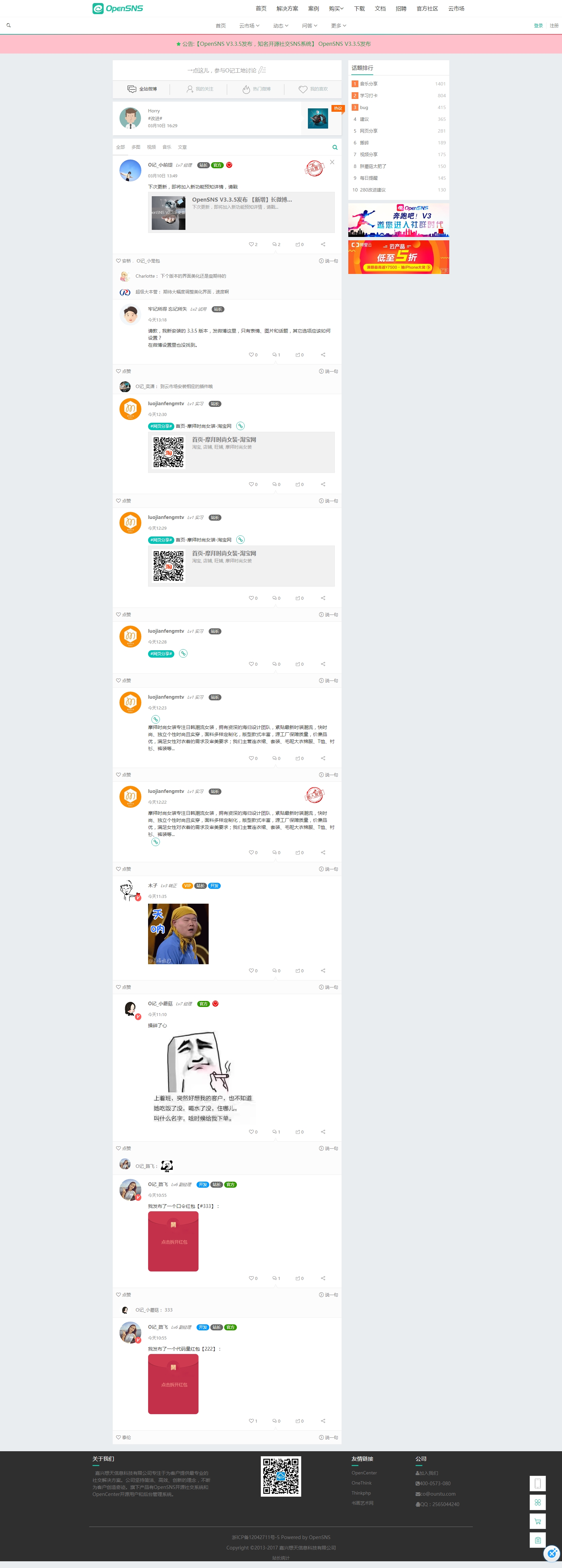OpenSNS一款有“身份”的开源免费SNS社交系统,包含 微博、资讯、活动、论坛、专辑、积分商城、群组、充值中心、 问答、分类信息、微店等模块,支持PC端、手机网页版、客户端、 微信版等多种平台,可以为客户快速搭建社交网站。2015年1月28日ThinkOX 正式更名为 OpenSNS。