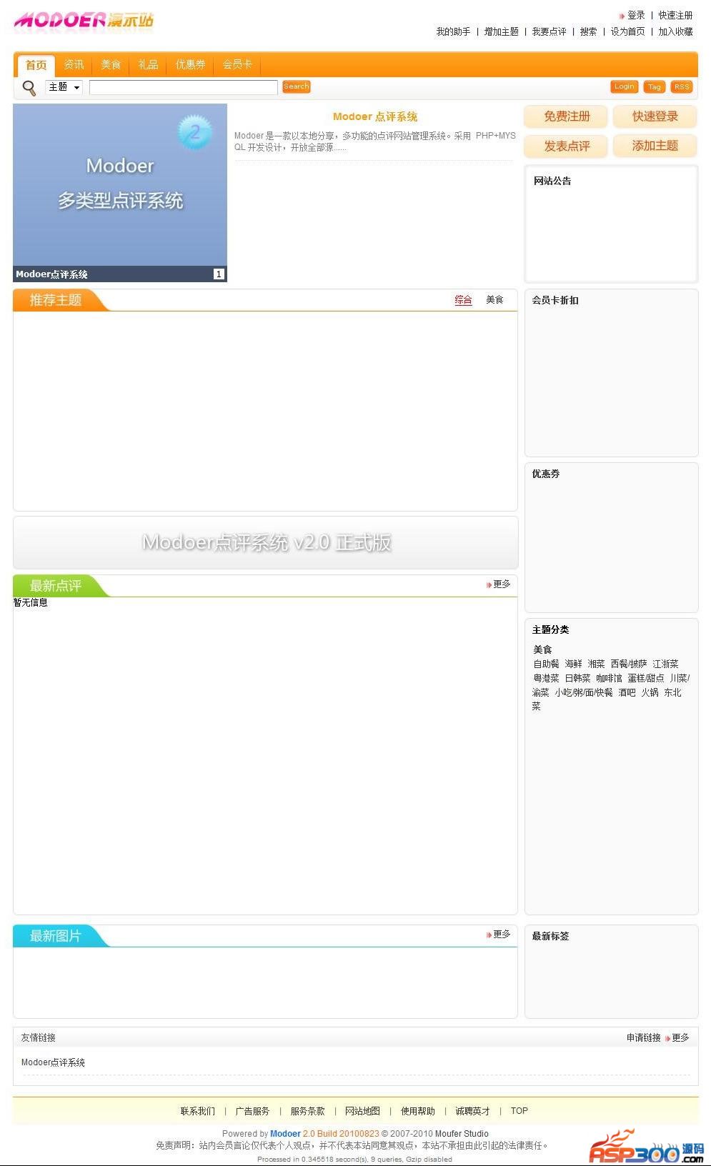 modoer 是一款以本地分享,多功能的点评网站管理系统。采用 PHP+MYSQL 开发设计,开放全部源代码。因具有非凡的访问速度和卓越的负载能力而深受国内外朋友的喜爱。