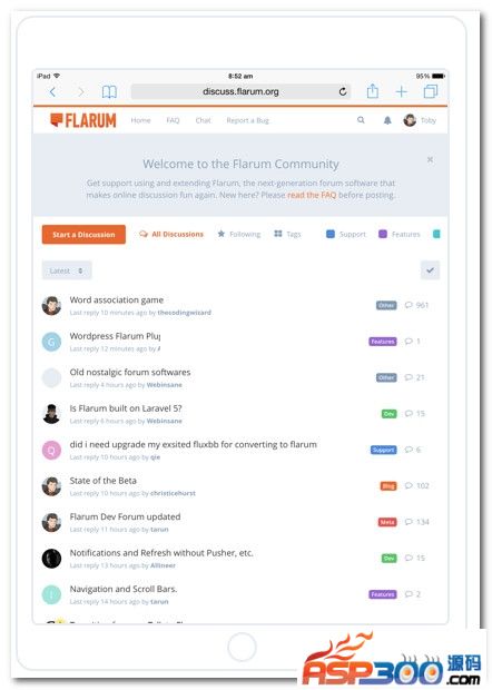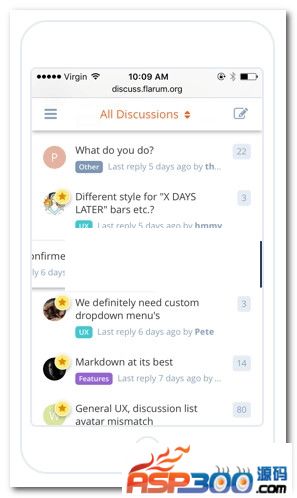 特点:flarum是充满创新的,体现在这美丽简洁的设计。 她不只是一个漂亮的皮肤。 她是论坛软件的重启,的文艺复兴。不臃肿、不复杂、不过度依赖。几分钟之内构建属于自己的社区。Flarum 基于 PHP 构建,因此很容易安装部署。界面使用 Mithril 构建,Mithril 是一个高性能的 JavaScript 框架。更少的等待,更多的交流。精美的响应式布局如果 Flarum 的桌面版界面没有打动你的心,那么他的移动版一定会的。Flarum was born to be touched.Flarum 不仅仅为程序员开发,而是为所有人开发的。Flarum 在设计之初就考虑了跨平台,开箱即用。并且 Flarum 的界面风格使用了 LESS,这样很容易更换主题。强大简约,并不简陋。定制性、可扩展性,都集成在了 Flarum 中。构建可扩展的软件是很困难的。值得庆幸的是,我们有多年的开发 esoTalk 和 FluxBB 的经验。Flarum 的开源架构是非常灵活的,他拥有完善的 API 和文档。