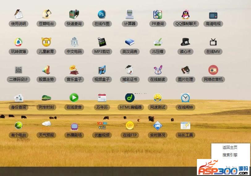 这套源码非常适合一些娱乐类网站使用,能够给自己的网站增加一个云端桌面的栏目,增强用户粘性,尤其是桌面中的音乐、网络电视、在线MV等功能,都有有效的增加访客在你网站的停留时间,甚至很多人都会因为这些功能收藏你的网站。