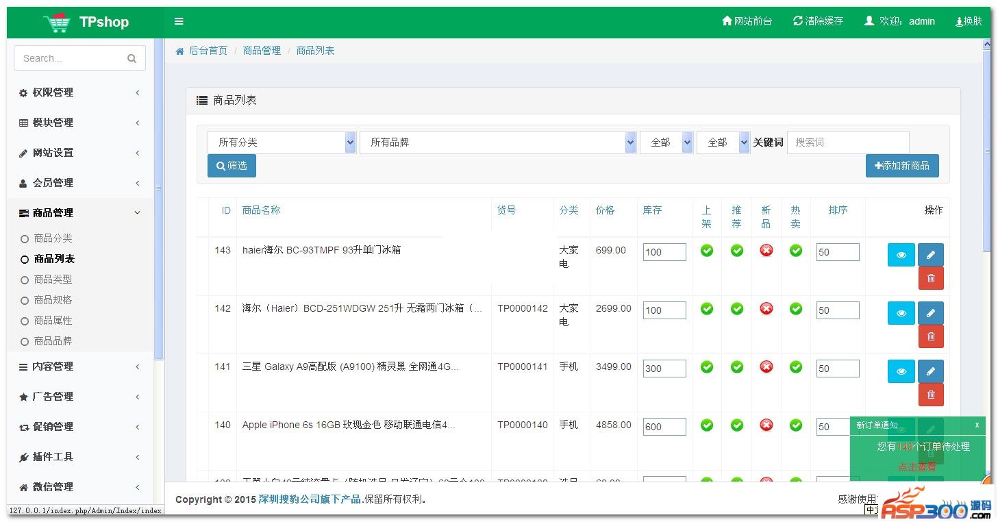 TPshop 是用thinkphp开发的shop 一款免费开源网店系统,适合企业及个人,包含 (微信商城 + wap + android + ios + pc) 二次开发非常方便, 详细的TPshop使用手册 + TPshop二开手册 + TPshop 98小时的二开视频教程,使开发者得心应手, 一看就懂 一听就会, 代码清晰简洁,通俗易懂. 丰富的插件和多套模板支持, 易扩展. 是目前国内首家最为完善的开源商城系统。系统支持多语言版本,操作简单,安全稳定,是广大用户二次开发的最佳选择。