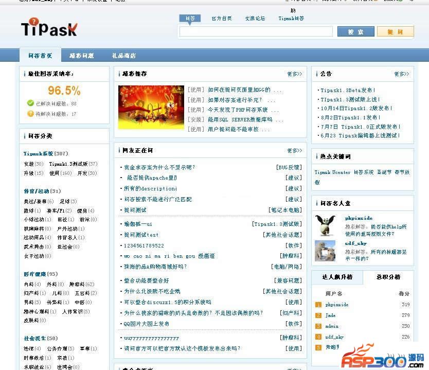 Tipask是一款开放源码的PHP问答系统,基于Laravel框架开发,容易扩展,具有强大的负载能力和稳定性。支持微信、手机登陆注册,支持悬赏提问,支持支付宝微信充值,支持邮件短信站内消息通知,支持全文检索。。。。更多特性请直接下载体验。