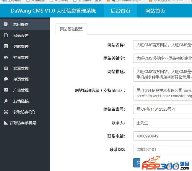 大旺CMS是一款简单易上手的企业网站cms系统,主要有网站配置、文章系统、导航、栏目、单页、广告以及其它一些功能。