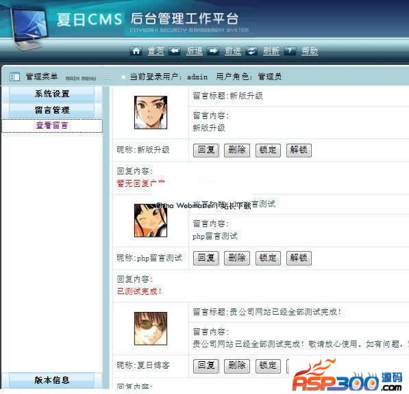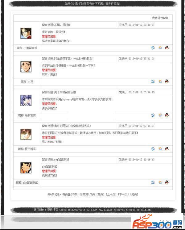 另可进行在线回复,删除,锁定、解锁、审核等功能,而且独立的管理后台也可以专门进行研究。制作目的是一个功能齐全,实用美观,便于嵌入网站的小型留言本,另一个目的是帮助新手用户学习研究使用。