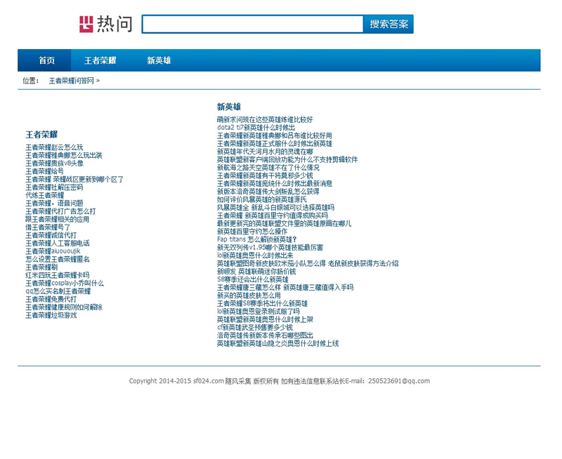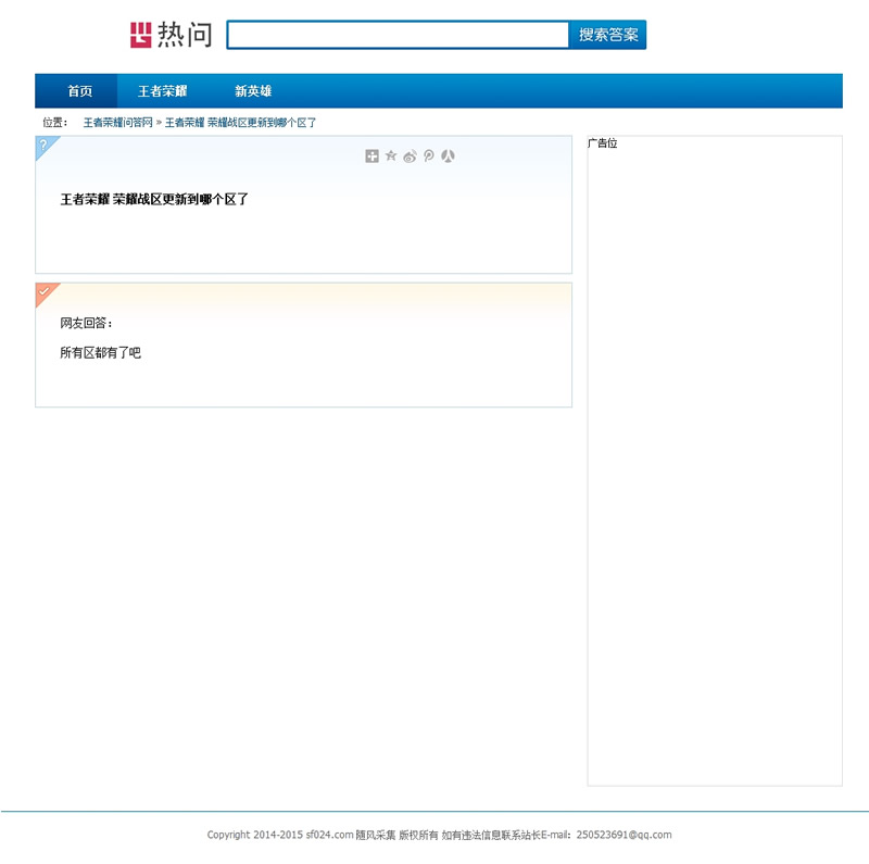 安装说明:1.首先打开/API/3.PHP 这个文件,里面有详细的配置说明如下://网站程序配置!$seo_1="你问我答网 国内优秀的知识问答网站"; //搜索引擎优化 - 标题后缀$seo_2="你问我答网,知识问答,网友提问,网友回答"; //搜索引擎优化 - 网站关键词$seo_3="你问我答网,国内优秀的知识问答网站"; //搜索引擎优化 - 描述网站//以上三个地方认真填写,严重影响收录量!$web="你问我答网"; //网站名称请填写$website="www.sf024.com"; //网站域名不要加http://$beian="辽ICP备14003759号-1"; //备案号没什么好说的$tj='' //网站流量统计代码//LOGO修改 style\img\transdmin-light.gif 文件 尺寸宽225PX X 高28PX//广告修改api/ad.php 文件,加入百度广告代码或者其他联盟广告代码即可!//缓存时间设置$cache_true=true; //缓存开关,如不需要缓存,请设置为 false , 如需要缓存清设置为true$cache_index="10"; //首页默认10分钟一更新$cache_list="30"; //列表默认30分钟一更新$cache_read="120"; //内容页默认120分钟一更新修改好以后,配置IIS伪静态,配置文件在\IIS下,不会的联系我!