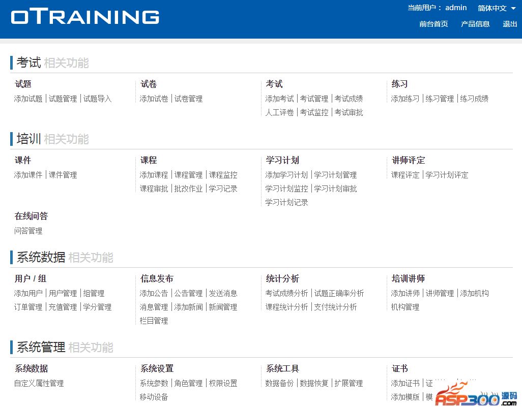 oTraining的主要功能包括了在线制作课件、在线制作课程、在线制作学习计划、录入和导入试题、人工组卷和随机组卷、断电保护和考试监控、成绩查询和修改、自动评分和人工评分、用户导入导出、无限的数据分类、创建任意级别的机构、丰富的统计分析、基于角色的权限管理、数据备份和恢复等功能。拥有至少14种题型、3种组卷模式、32项考试发布参数、10多种统计方式、支持3种流行的课件格式、支持在线问答、68个功能模块。兼容IE6、IE7、IE8、IE9、FireFox、Chrome、Opera等主流浏览器。