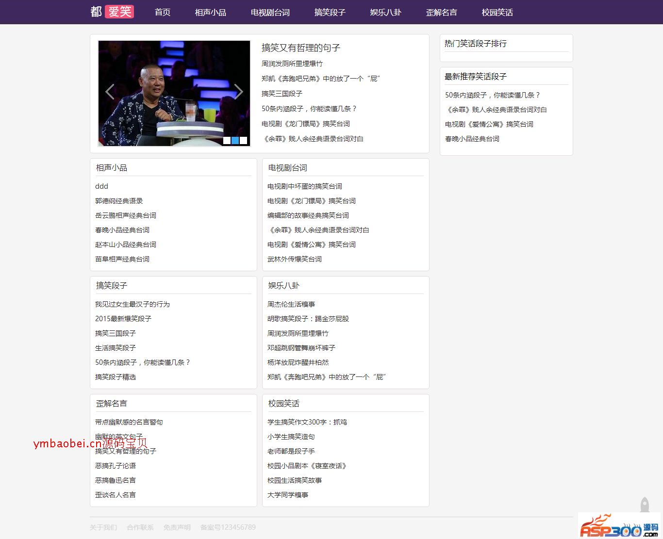 紫色搞笑笑话类织梦整站程序,测试完整无错,兼容主流浏览器。 模板包含安装说明,并包含测试数据。 下载地址 下载地址已转移到新版网站,请点击左上角-首页,在新版网站搜索此套源码的标题进行下载。