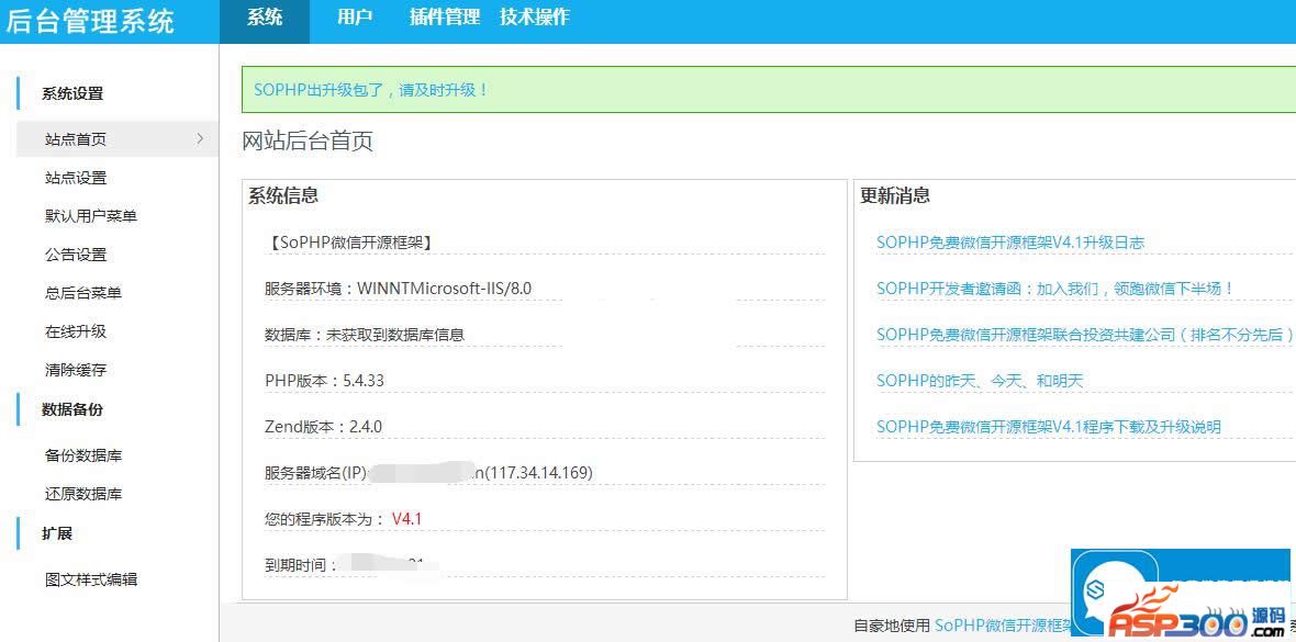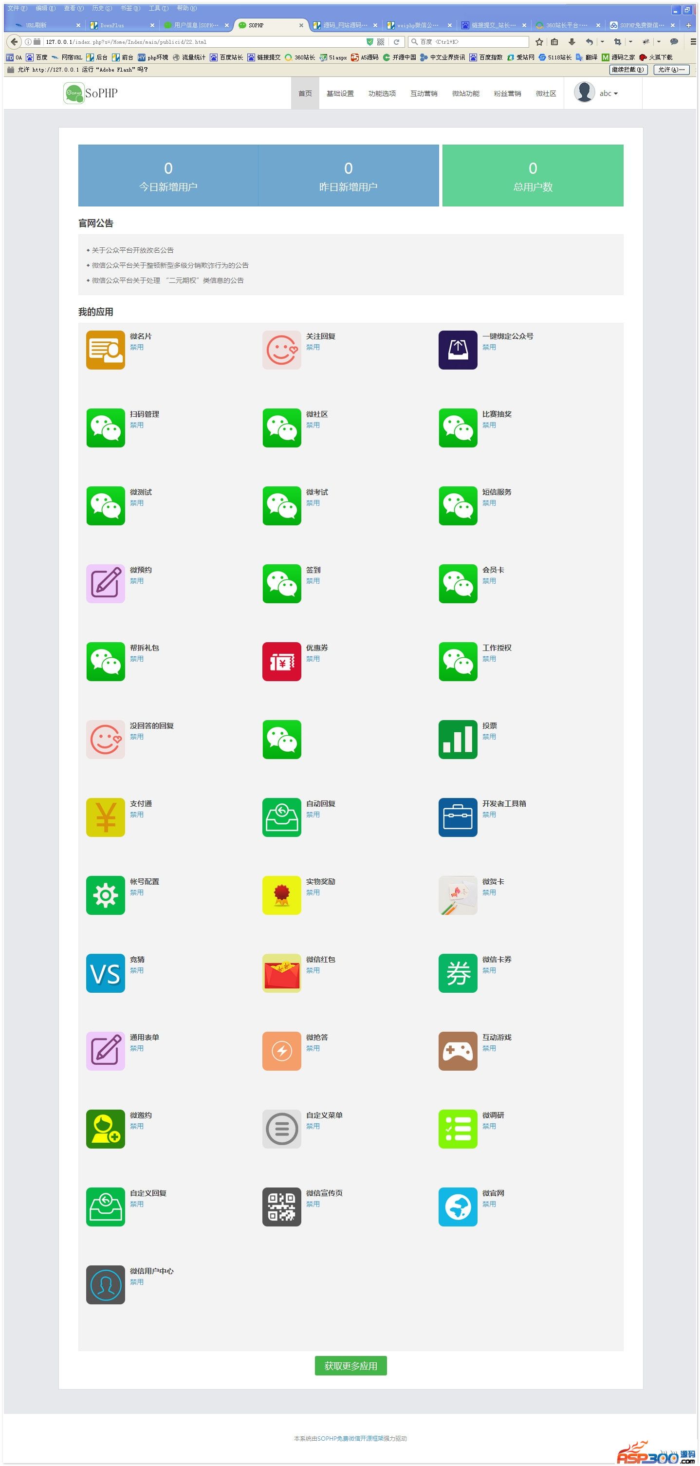 主要特性:1、基于TP2、支持套餐设置和用户有效期3、支持多用户多公众号管理4、详细的二次开发文档,并不断更新增加相关开发案例提供学习参考5、微信功能插件化开发,更易于定制和二次开发6、非认证订阅号借权(借权后可使用高级功能)7、搭载强大的应用商城系统,随时下载所需功能(应用商城地址:www.sophp.cn)主要功能1、微信接口消息交互系统2、微信插件管理系统3、套餐管理系统4、附件分离存储(可单独设置存储位置:七牛或本地)5、后台建模系统6、用户行为系统7、系统日志系统8、数据备份和还原9、微信多用户多公众号管理系统10、一键授权(授权登录)11、积分系统12、微站功能(4G微官网)13、粉丝营销14、群发系统15、客服接口群发16、模板消息17、短信接口18、小票打印机接口19、一键更新(在线更新)20、自动回复21、会员卡系统22、素材管理系统23、支付系统24、数据统计分析25、应用商城26、用户有效期限27、用户单独显示菜单28、扫码核销29、工作授权30、普通订阅号借权(借用认证服务号权限)
