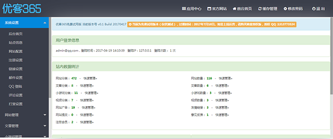 优客365网站分类导航系统是个跨平台的开源软件,基于PHP+MYSQL开发构建的开源网站分类目录管理系统,具有操作简单、功能强大、稳定性好、扩展性及安全性强、二次开发及后期维护方便,可以帮您迅速、轻松地构建起一个强大、专业的分类目录或网址导航网站。