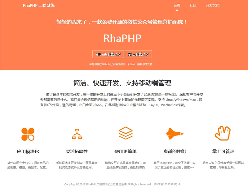 RhaPHP 是一款免费开源的微信公众号管理营销系统!也是一款微信公众号开发框架。简洁,灵活,快速易开发,应用模块化,支持移动端管理微信公众号。基于 THINKPHP5,简单的代码即可实现微信公众号通信与接口实现。不需要花大量时间研究系统即可快速开发微信应用,rhaphp在微信开发有着灵活机制,支持移动管理微信公众号。系统运行环境 PHP+MYSQL。