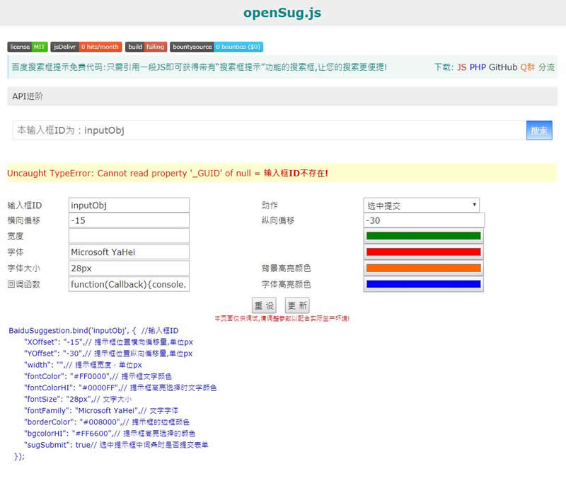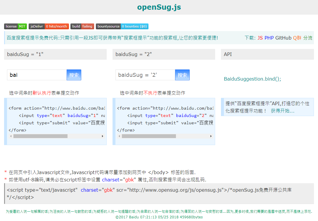 百度搜索框提示免费代码配置调试程序。openSug.js旨在帮助站长、开发者只需引用一段JS即可获得带有“搜索框提示”功能的搜索框,让搜索变得更便捷!