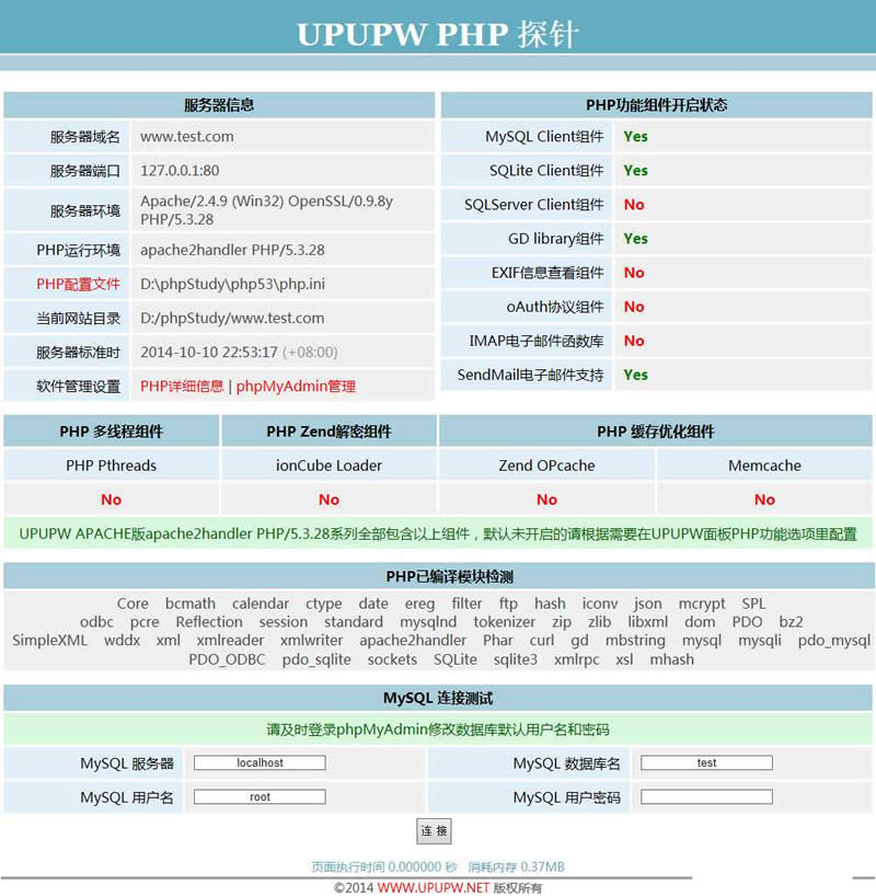 UPUPW PHP探针通用版,优势:支持最新PHP7.2系列版本,完全兼容PHP5.2-PHP5.6组件和参数的检测,防XSS漏洞攻击。